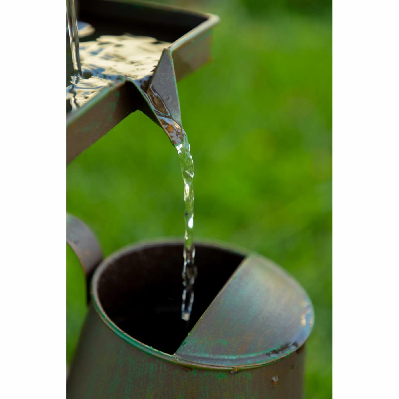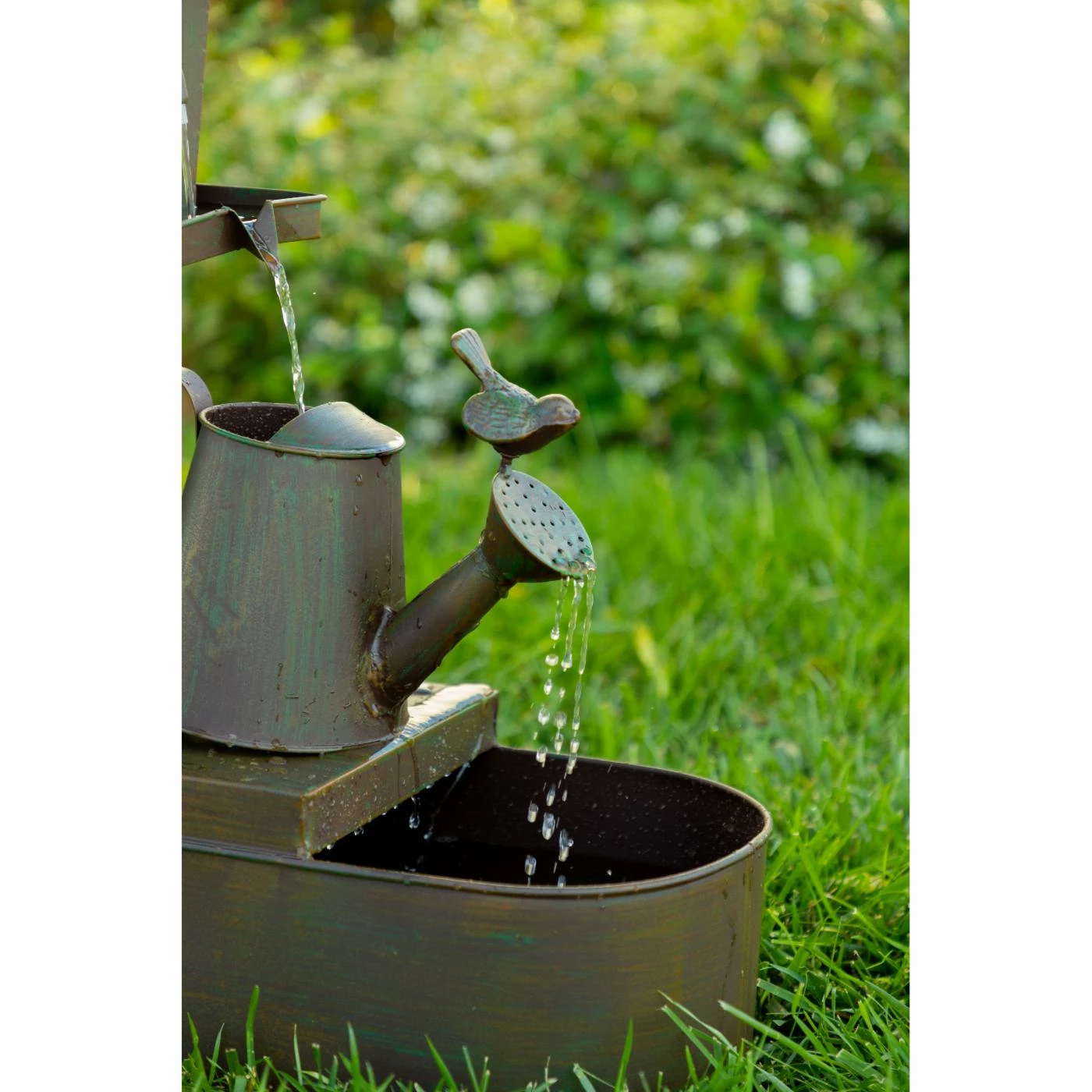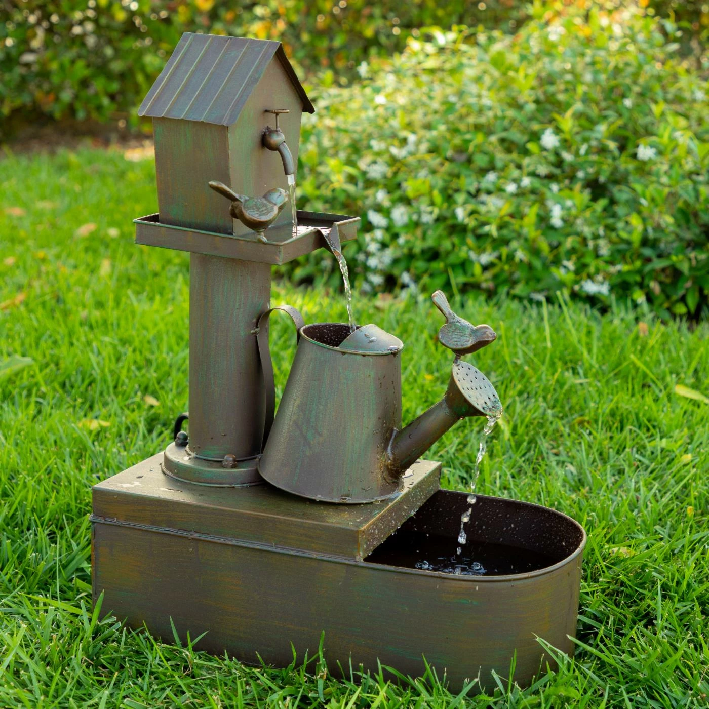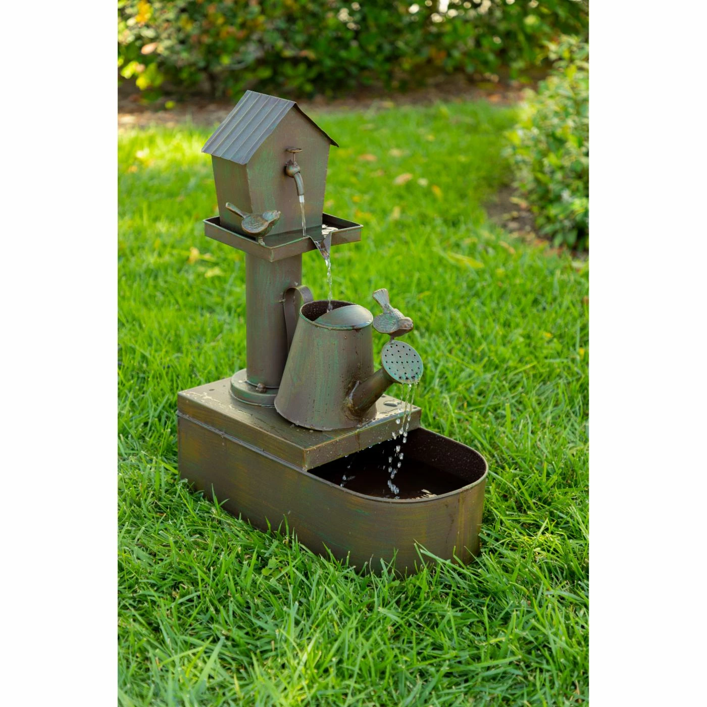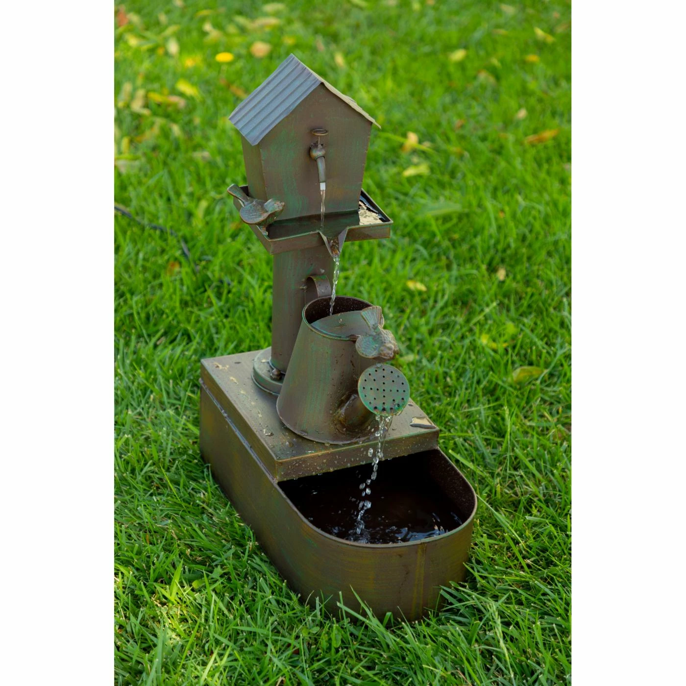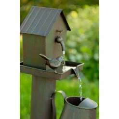 The Alpine Birdhouse into Watercan Outdoor Floor Fountain brings rustic country charm into your garden space. Water cascades from bird house to watering can and into the metal basin below. Birds and a distressed bronze finish enhance the look of this iron fountain. Pump included.