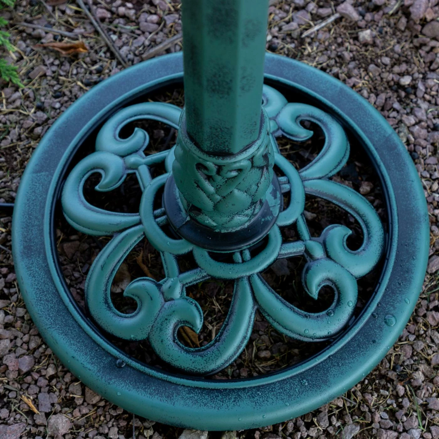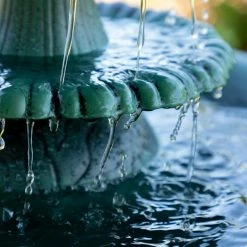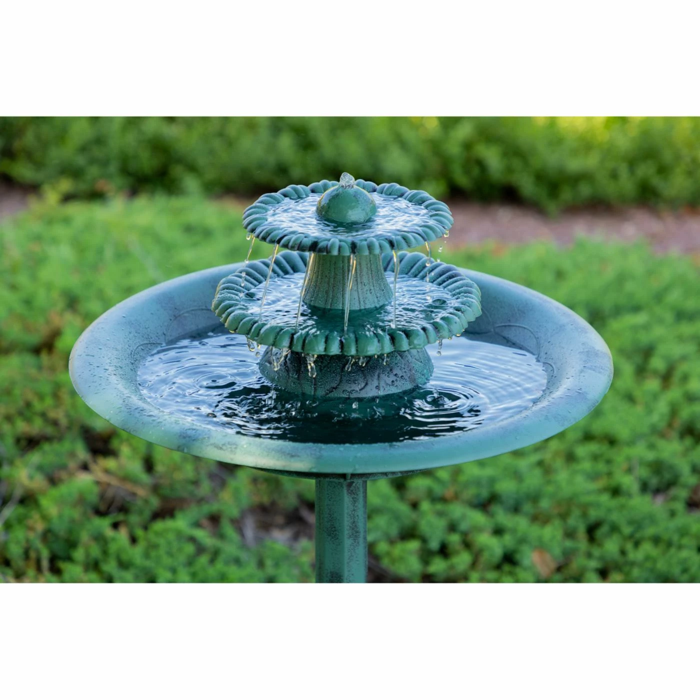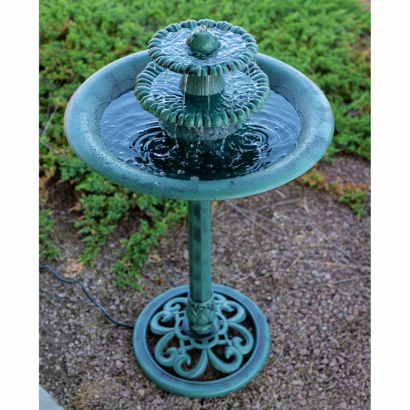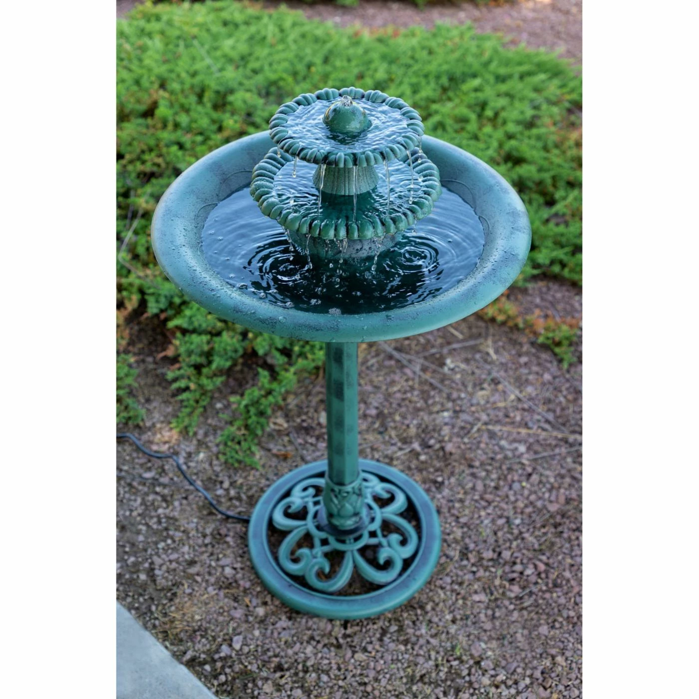 This majestic tiered water fountain in a lively green finish makes a great focal point either indoors or out. The Alpine Avant Garden Three-Tier Bird Bath Fountain is just the right size to fit in any garden or large greenhouse. Circular base with scrolled detail holds the support pedestal. Wide-lipped bowl measures 20 inches in diameter, and is a great invitation for birds and butterflies to come visit. Two tiers rise above the bowl; both with textured edges to allow water to gracefully flow many rivulets. A wonderful, soothing sound will emanate. Made from a durable polyresin, the color will not fade. Weather-proof construction means it will last for years. The water fountain contains everything you need. Self-contained water basin and pump re-circulate water, so no special plumbing hookup is needed. Simply fill with water, and plug in! The fountain measures 20L x 20W x 35H inches.