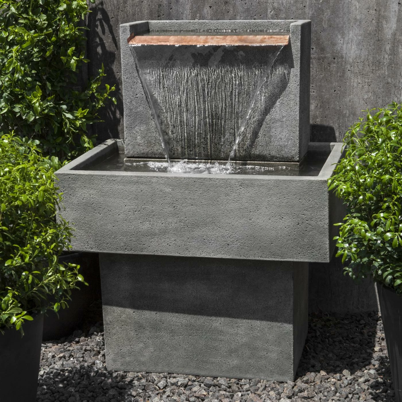 Contemporary with bold, angular lines and a streamlined appearance, the Campania International Falling Outdoor Water Fountain l lends a sophisticated touch to your garden, lawn, or patio. This boxy, stacked outdoor fountain is crafted of heavy cast stone and enriched with a hand-applied patina that ages naturally over the years for a lifetime of enjoyment. Plug your fountain into any standard 3-prong outlet to recirculate and conserve water via the included pump to enjoy the soothing sound of flowing water.