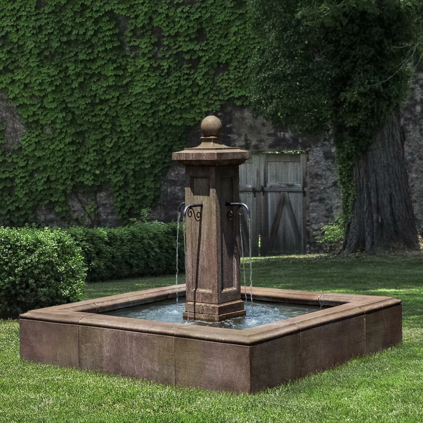 Create a fetching landscape with the Campania International Luberon Estate Outdoor Fountain, designed with scrolling downspouts on each side of a robust, squared center column. This sophisticated outdoor fountain is a permanent home addition, crafted of heavyweight cast stone that withstands the test of time. The natural, hand-applied patina wears and weathers over the years to create the look of ancient stone, enhancing the overall appeal of your courtyard or lawn. An included pump recirculates and conserves water without the use of complicated additional plumbing.