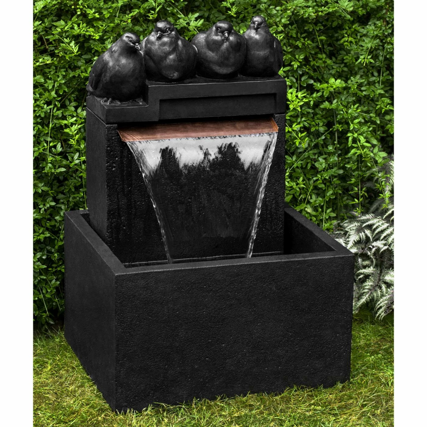 A string of detailed birds grace the upper ledge of the Campania International Quartet Outdoor Fountain, creating a whimsical, lighthearted scene. This charming outdoor fountain is crafted of cast stone that holds up to a lifetime of the elements and is finished with a luxurious patina that ages naturally over time. An included pump removes the need for additional plumbing, powered by any standard three-prong outlet for more versatile placement options.