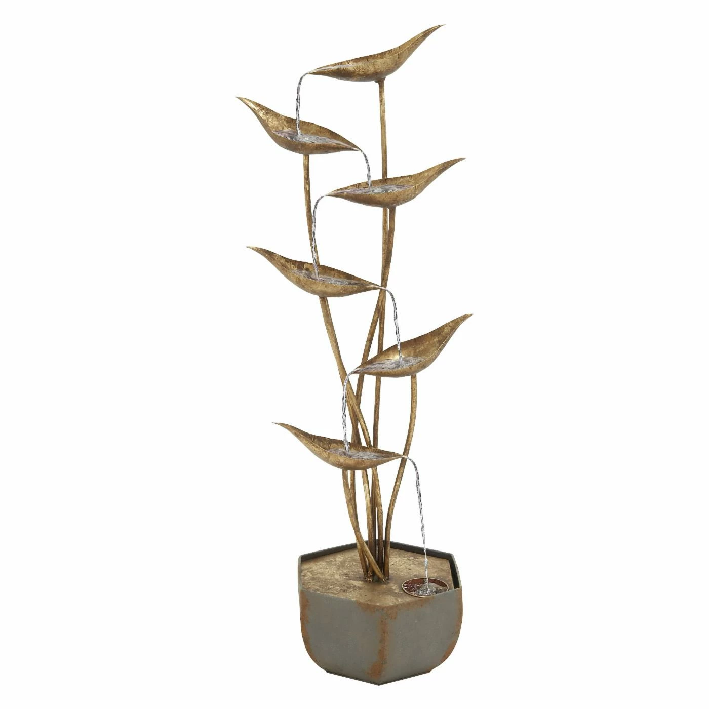 Shimmering milkweed pod-inspired shapes give this DecMode Cascade Metal Fountain its modern organic vibe. This metal fountain features delicate details and a brass and distressed sage green finish. Water cascades down the pods into a hexagonal reservoir base. This fountain stands 43 inches tall and is designed to grace indoor or outdoor living spaces.
