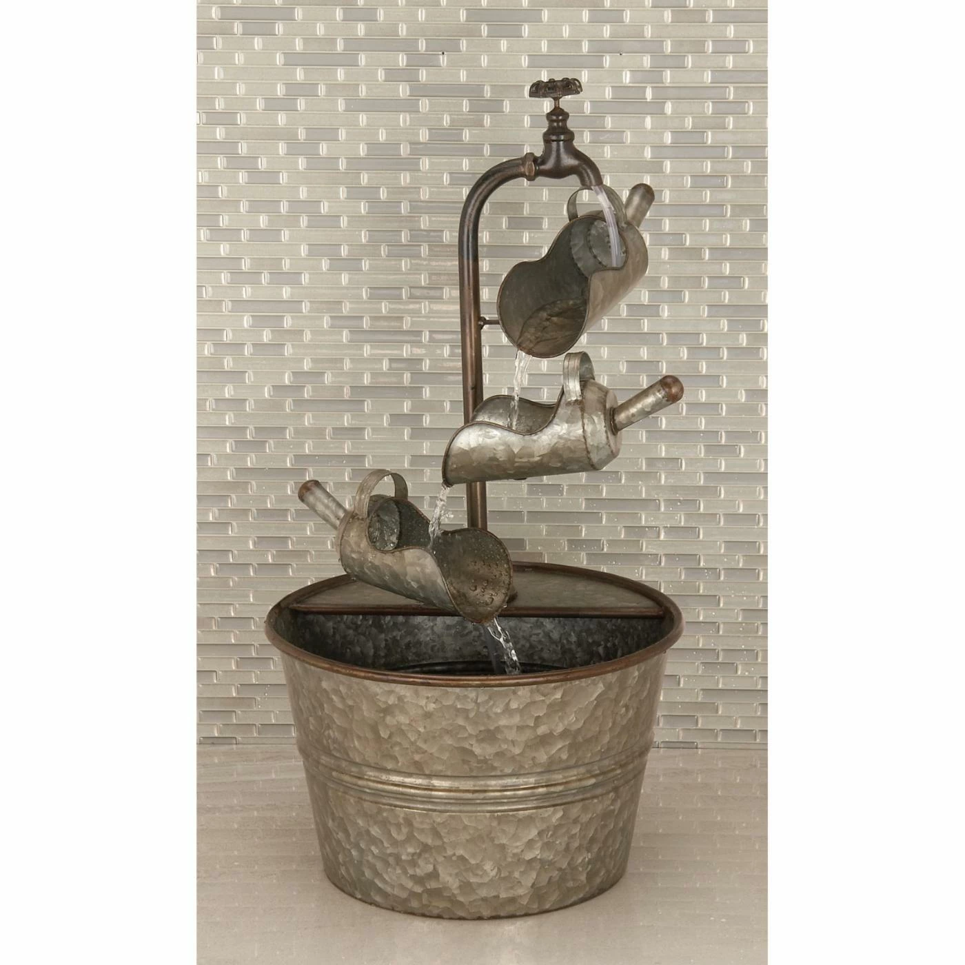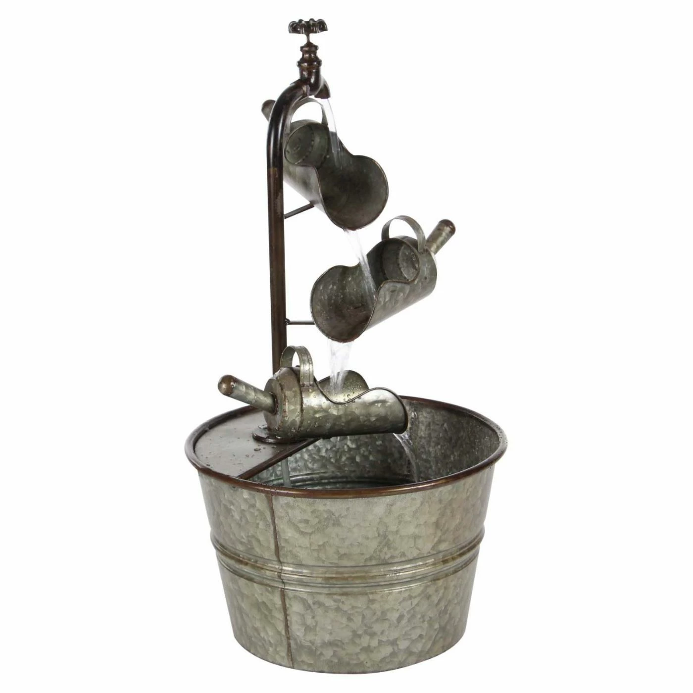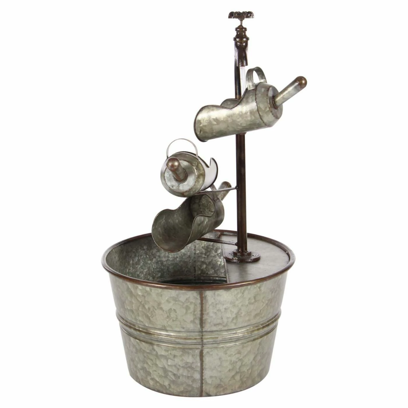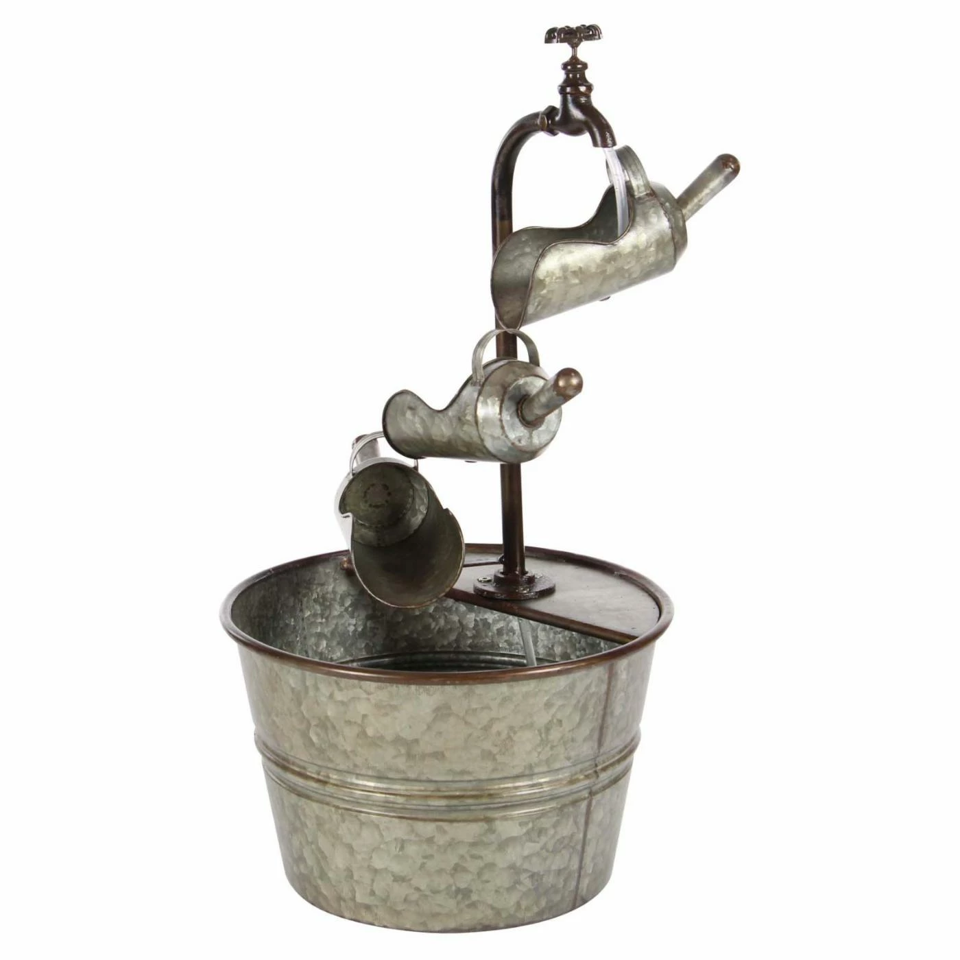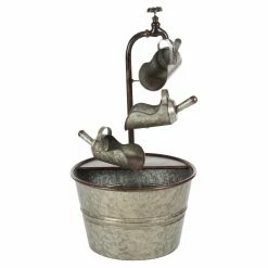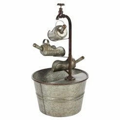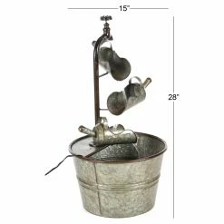 A trio of vintage-style scoops sends water trickling downward into the bucket basin of the DecMode Farmhouse Iron Faucet with Bucket Design Fountain. All-metal construction lends a durable design to this fountain, and its galvanized gray finish adds the finishing touch to its antique look.