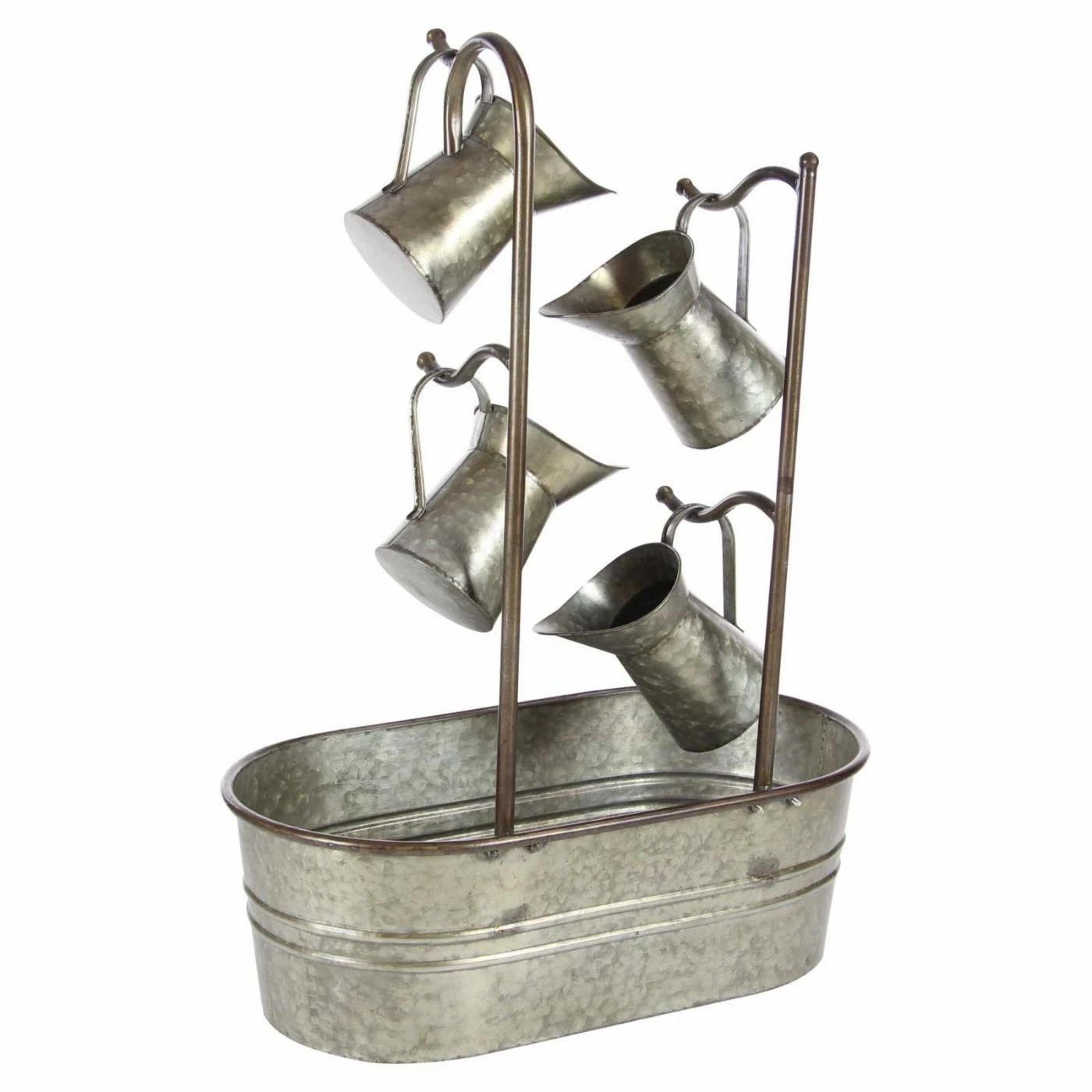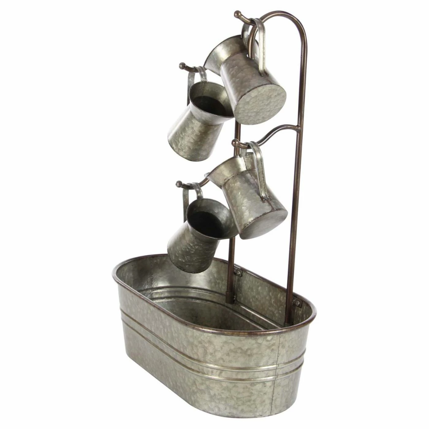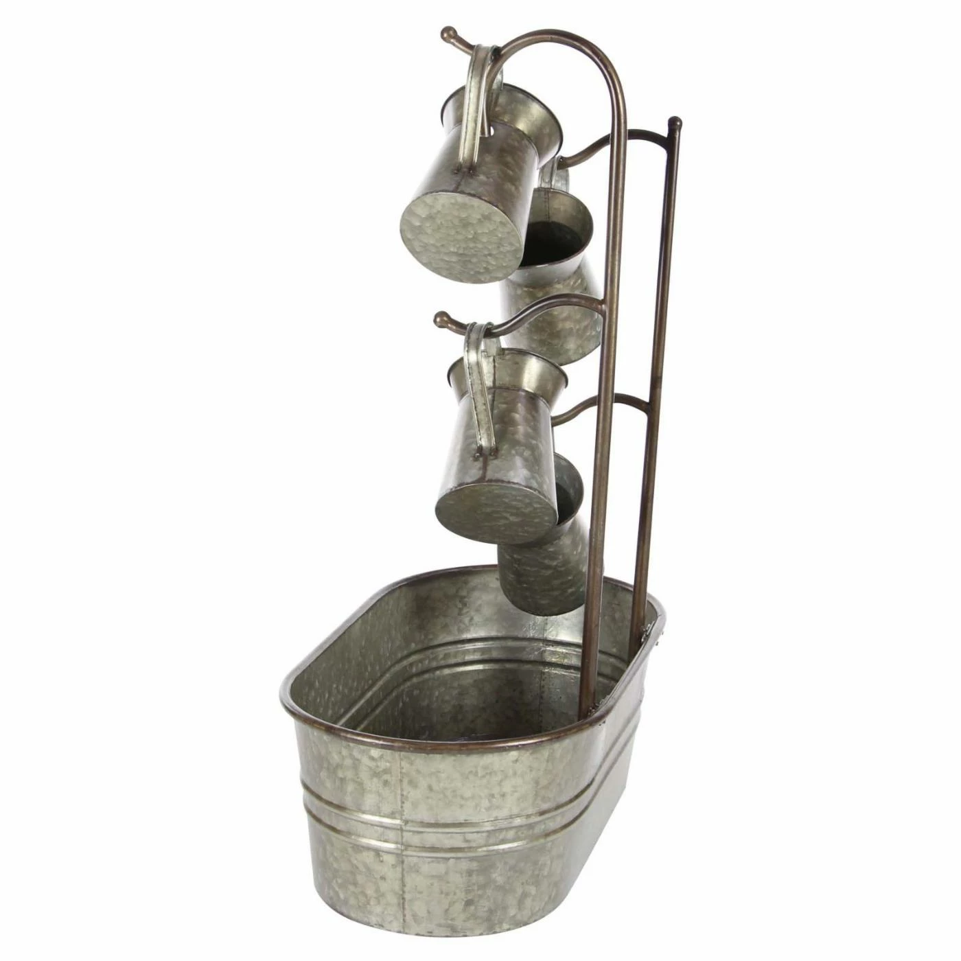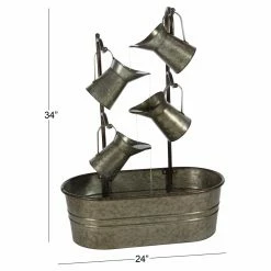 The vintage pitcher design of the DecMode Farmhouse Iron Oval Basin with Tiered Jugs Fountain creates a look that’s steeped in nostalgia. This fountain is made from sturdy metal components and finished in a galvanized gray that enhances its rustic charm.