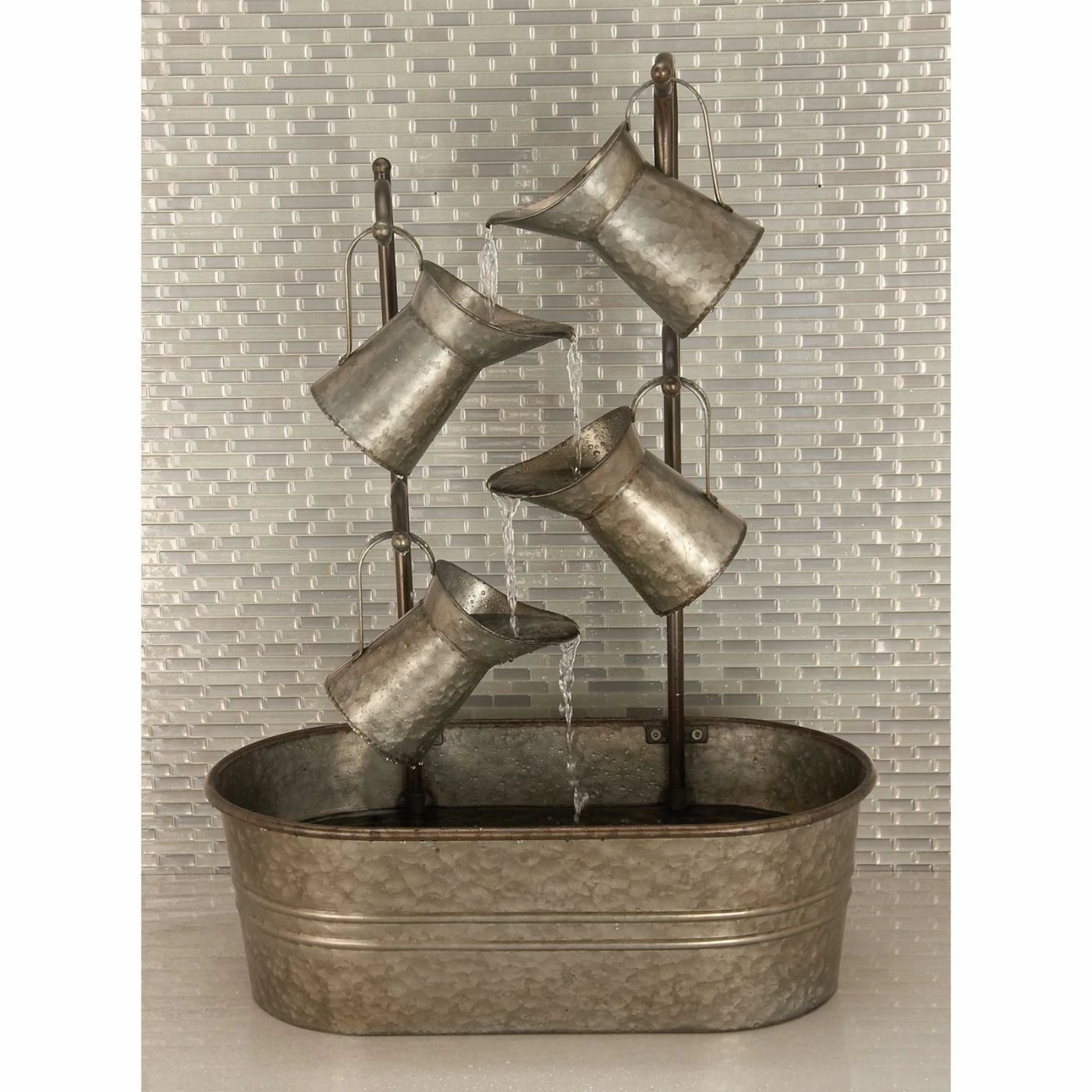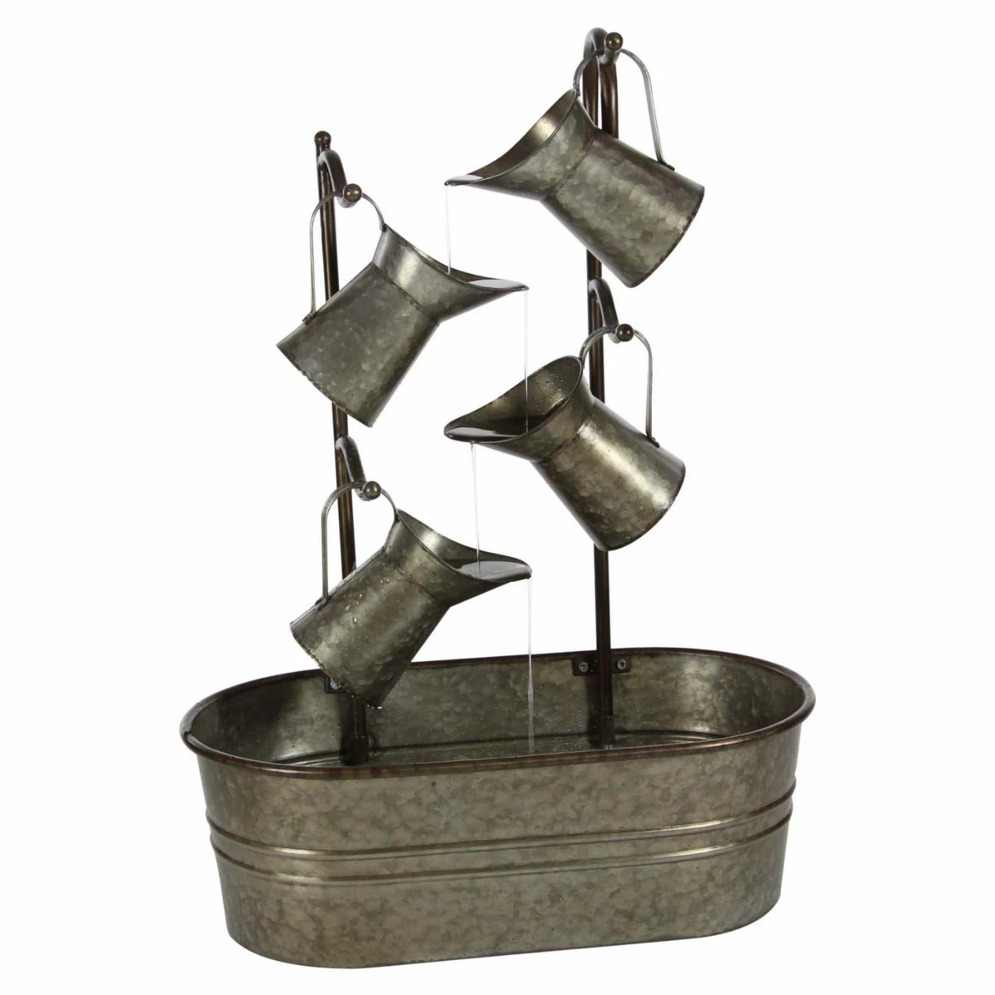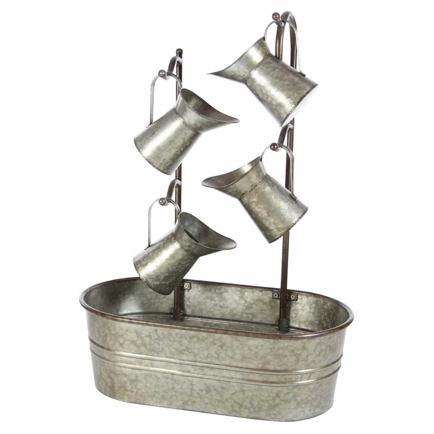 The vintage pitcher design of the DecMode Farmhouse Iron Oval Basin with Tiered Jugs Fountain creates a look that’s steeped in nostalgia. This fountain is made from sturdy metal components and finished in a galvanized gray that enhances its rustic charm.