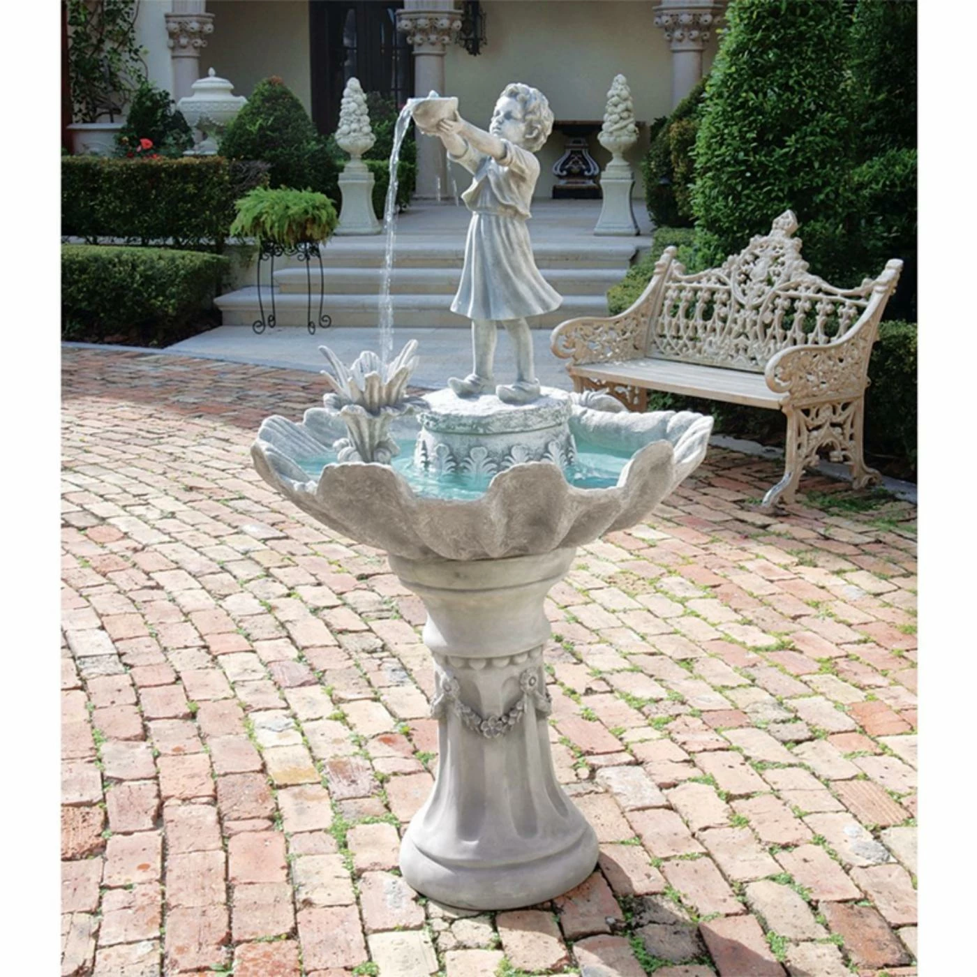 Intricately carved with amazing detail. The Design Toscano LAcqua di Vita Sculptural Fountain creates a classic ambiance in your landscape. This resin water fountain features a carved child pouring water into a flower. The basin features floral garlands and a scalloped base. Each incredible details is highlighted by the stone finish. It includes a quiet pump and doubles as a bird bath.