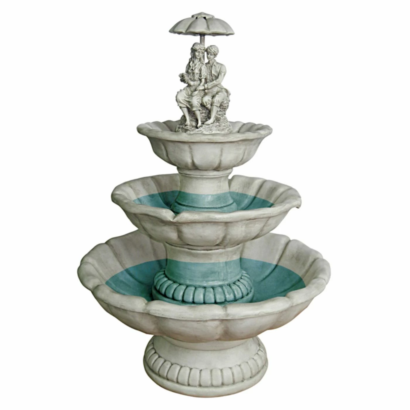Transform your garden into a romantic escape with the Design Toscano Lovers Under Umbrella Sculptural Garden Fountain. This lovely three-tiered fountain features a pedestal design, adding a classic, sophisticated feel to any outdoor space. The turquoise tinted bottoms of each bowl lend a refreshing aqua reflection that will make you feel like you’re on vacation in your own back yard. The high-quality resin construction will stand up to harsh weather, and the included water pump minimizes water usage by recycling it in a hidden reservoir.