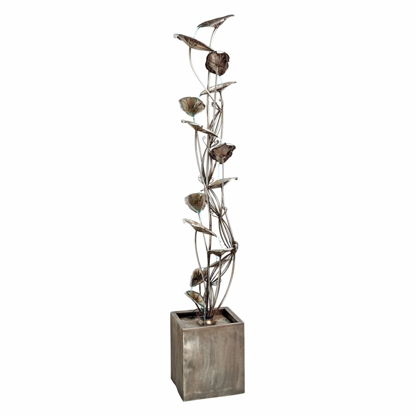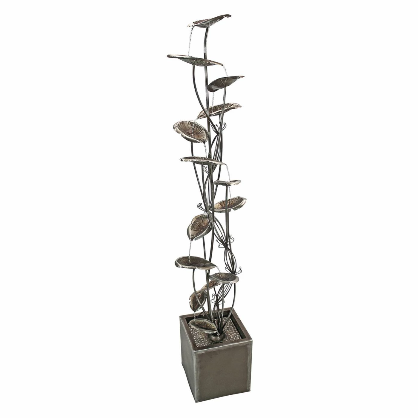 Relaxing and beautiful, the Design Toscano Wandering Leaf Cascading Garden Outdoor Fountain brings a touch of organic artistry to your outdoor living space. This fountain features delicate leaves that let water gently trickle down from one to the next. Its all metal construction and silver hand applied finish looks great in any setting. Includes recirculation pump.