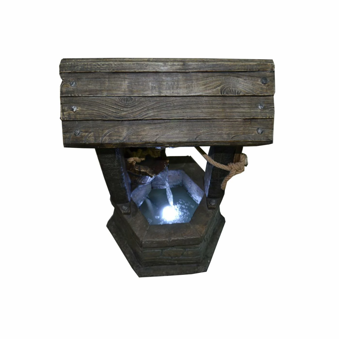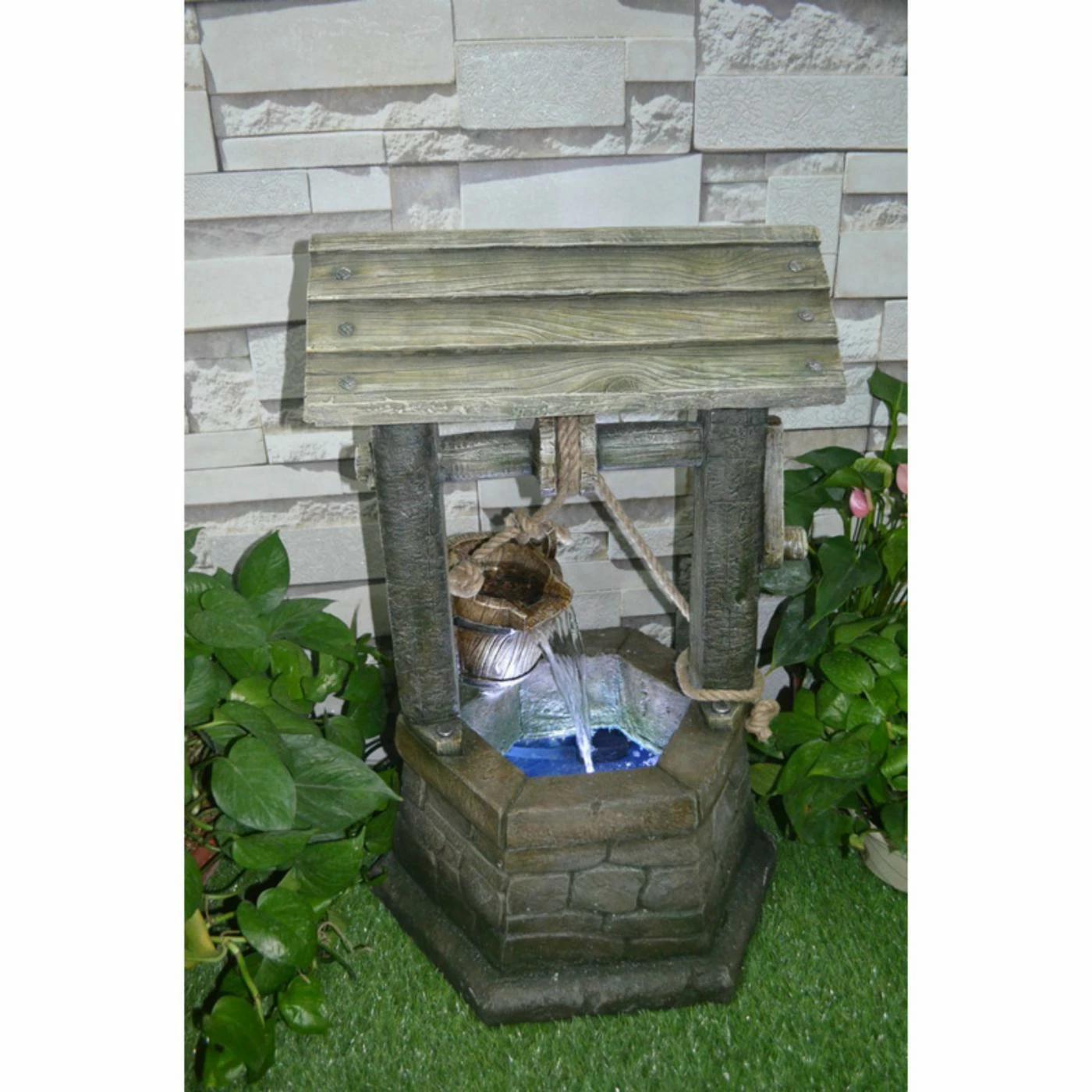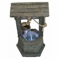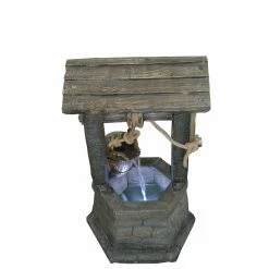 Elevate your landscape with the Hi-Line Gift Ltd. Wishing Well with Pouring Bucket Fountain with LED Light. It’s carefully crafted from durable polyresin to have a realistic look. The interior pool is underlit and gives off an alluring glow in the dark.