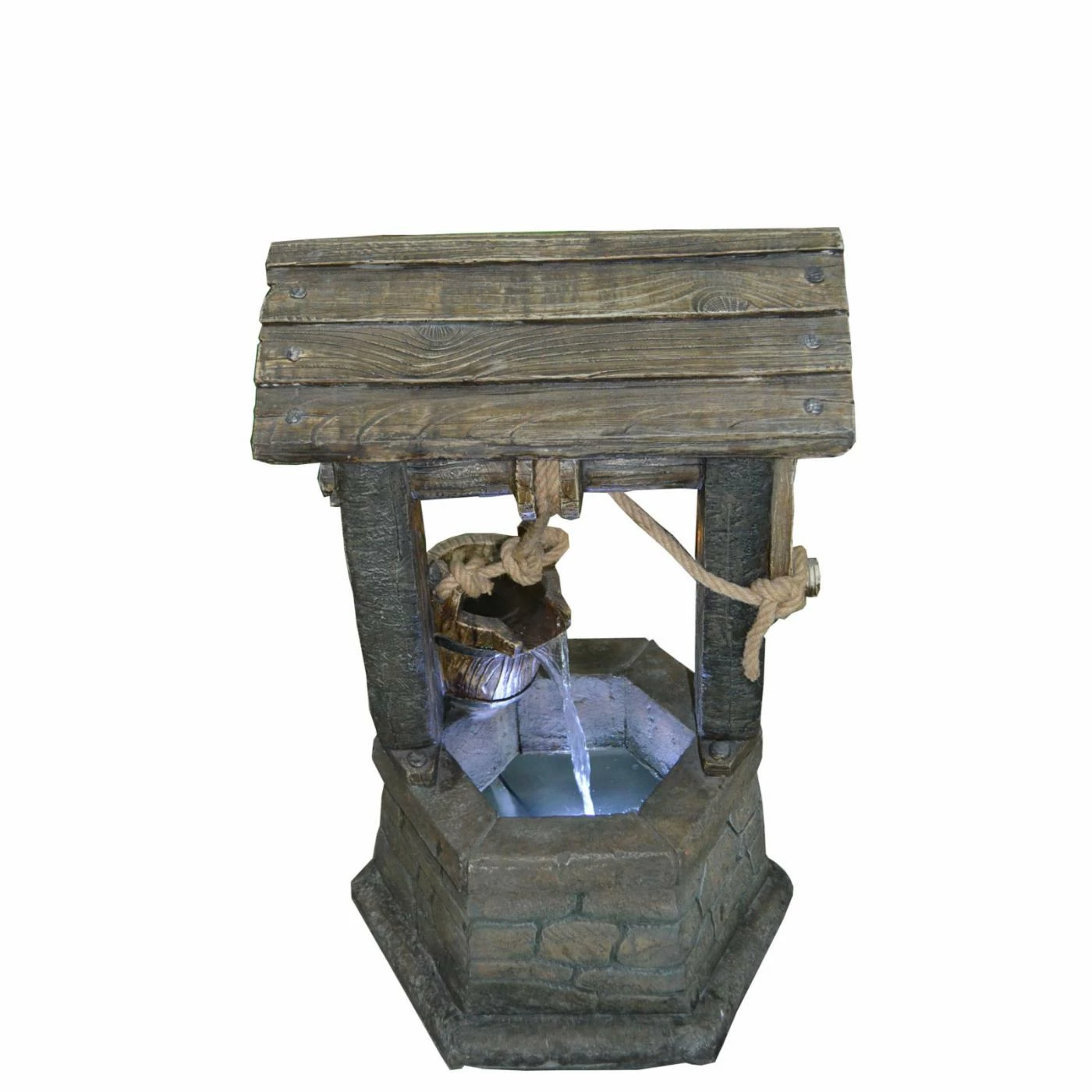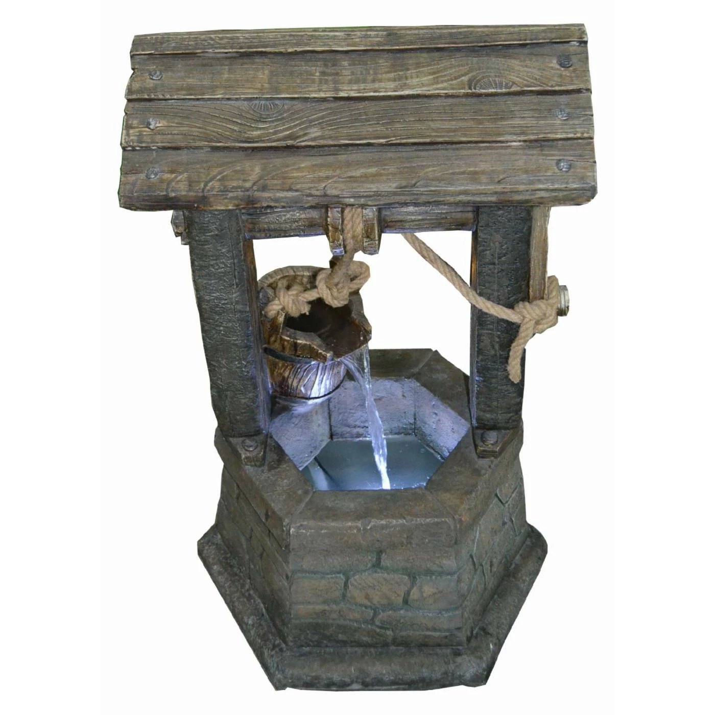 - Bucket pours water into a wishing well