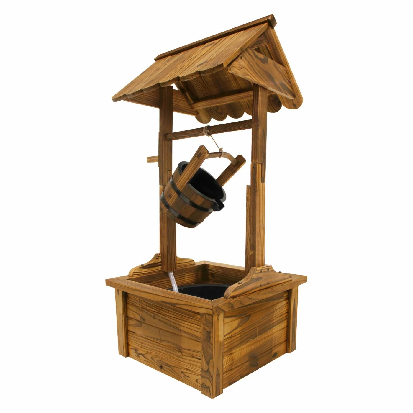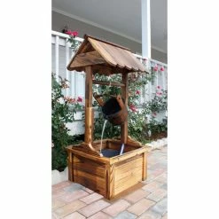 A charred wood construction adds to the character of the fun, ode-to-the-frontier feel of the Leigh Country Wishing Well Fountain. The wood used for the fountain was charred by Lehigh Country’s patented process. This fountain features a hanging bucket to provide soothing sounds of water in your lawn or garden. It was finished with a rich glaze that resists mildew, mold, and stains.