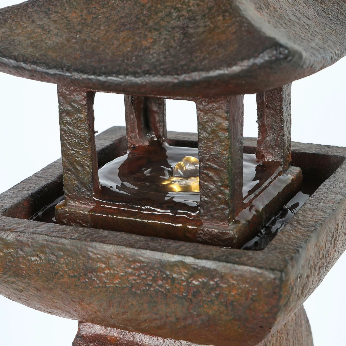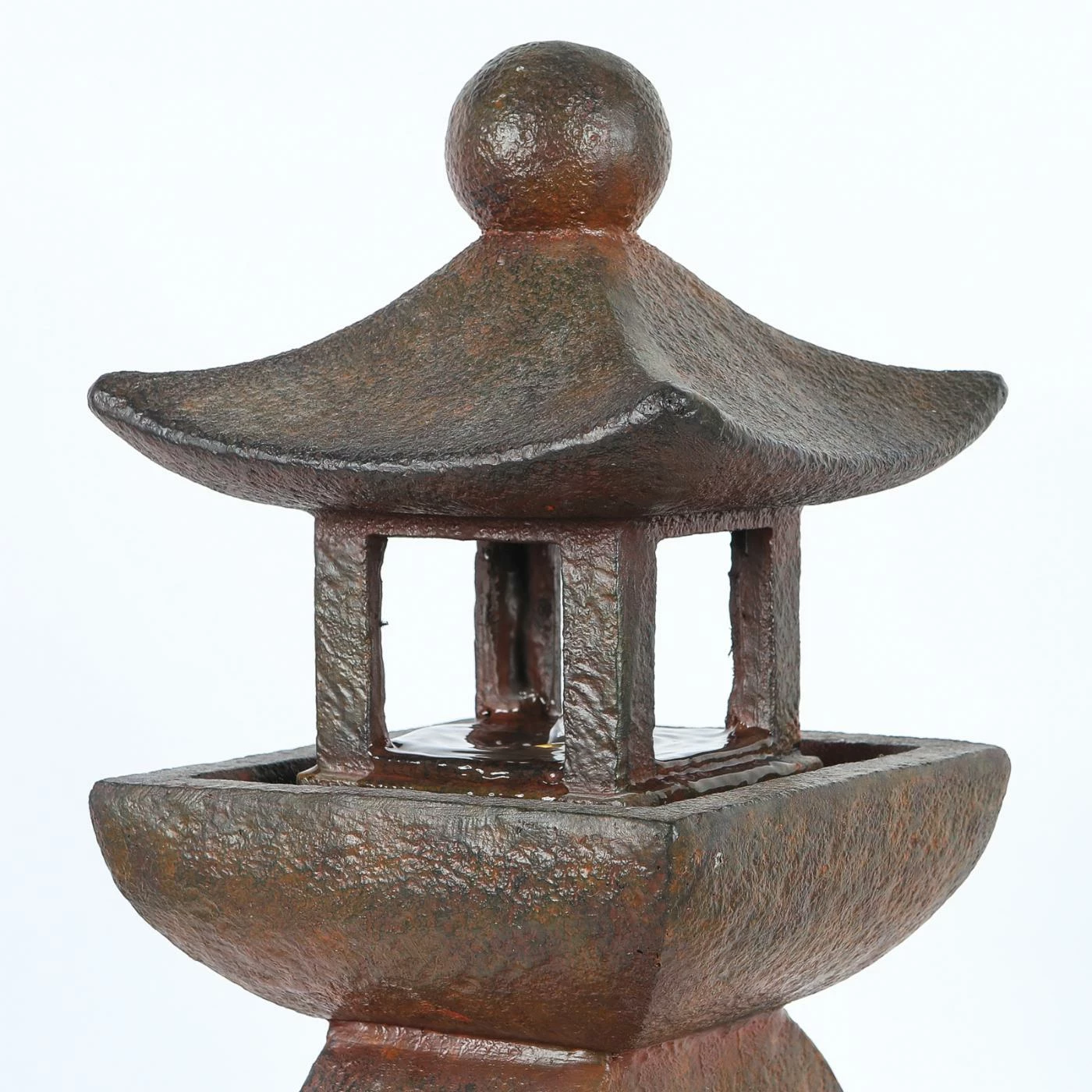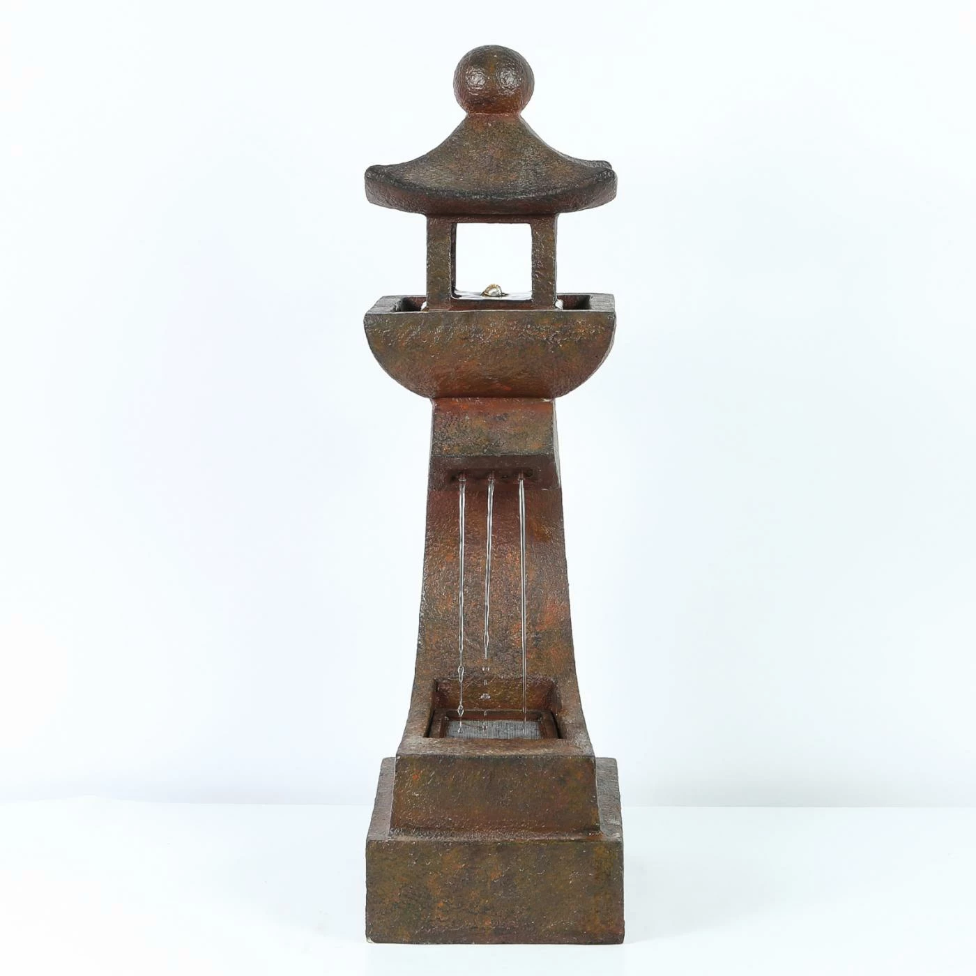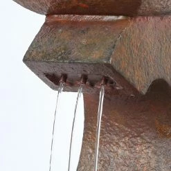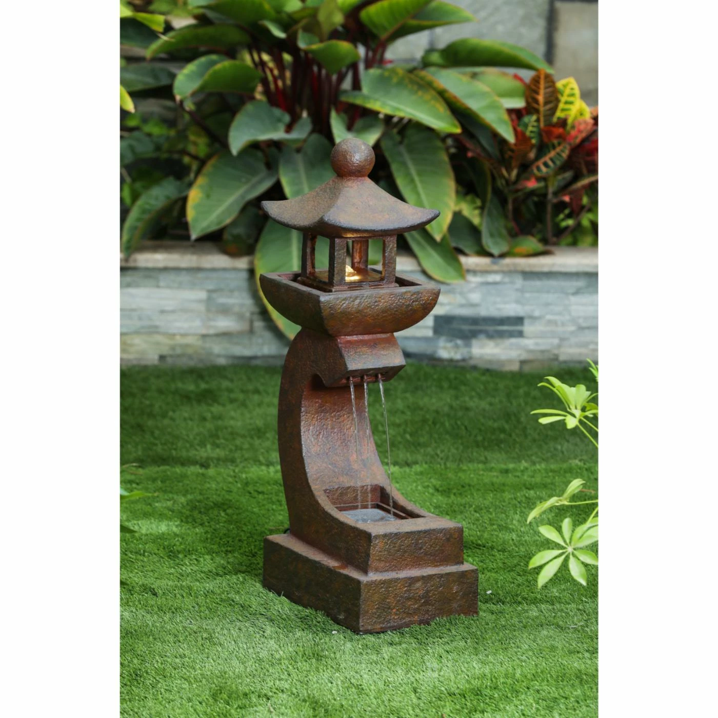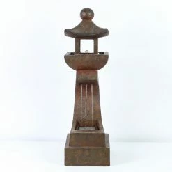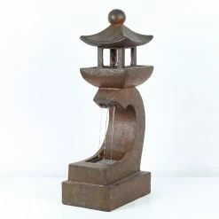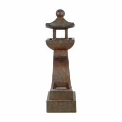 Perfect your Zen garden with the soothing LuxenHome Asian Pagoda Outdoor Fountain with LED Light. This outdoor fountain is made of polyresin with a coppery stone finish for a look that effortlessly blends with your garden or patio. A small pagoda sits on a curved pedestal and water runs from the pagoda to the base of the pedestal. An electric pump is included.