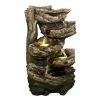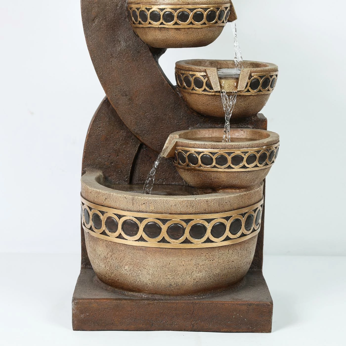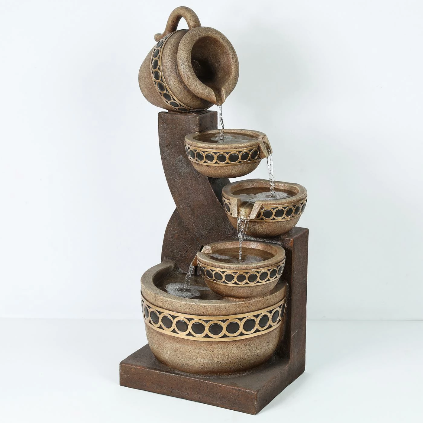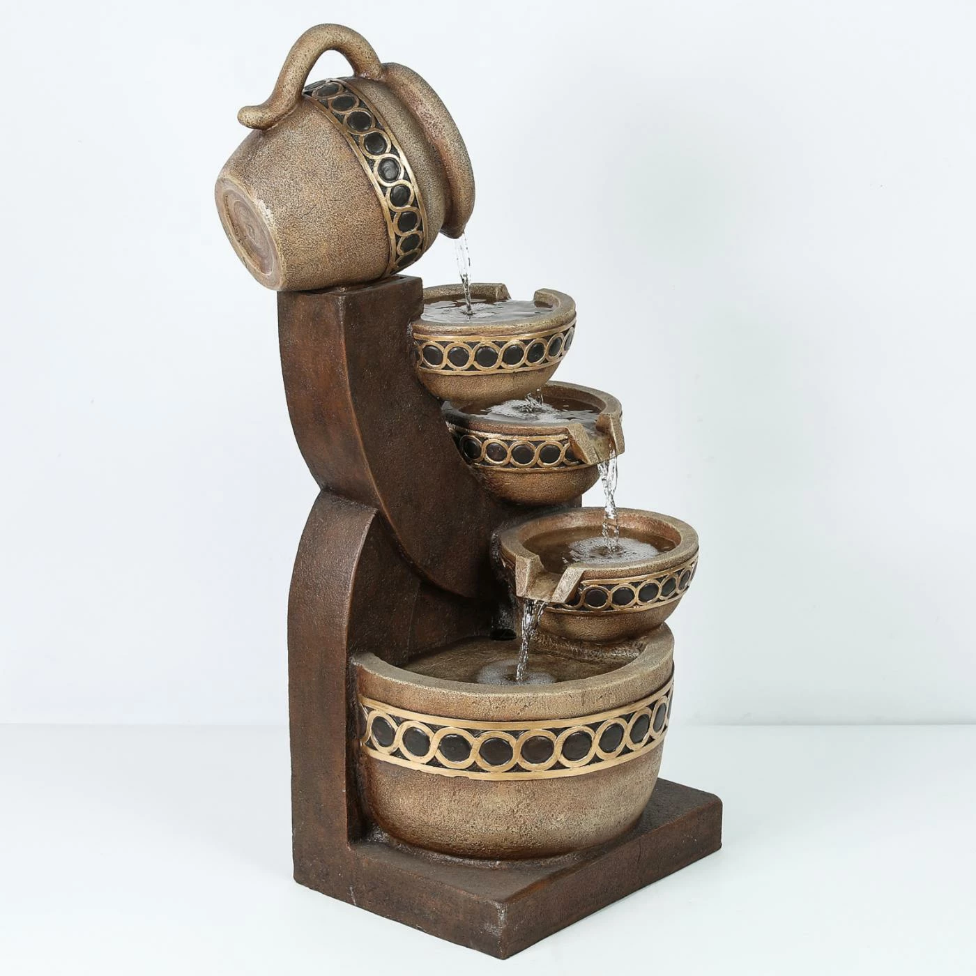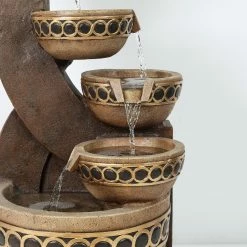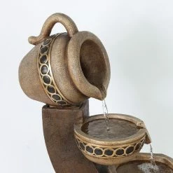 The LuxenHome Cascading Pitchers Outdoor Fountain features old-world designs and decorative black and gold banding for the look of ancient pottery. Water spills from a jug at the top of this outdoor fountain flows into tiered pots into a bottom basin. Water is recirculated by the included electric pump. The fountain is made of highly durable resin, but realistic finishes and textures give it the look of real stone.