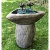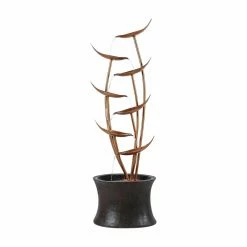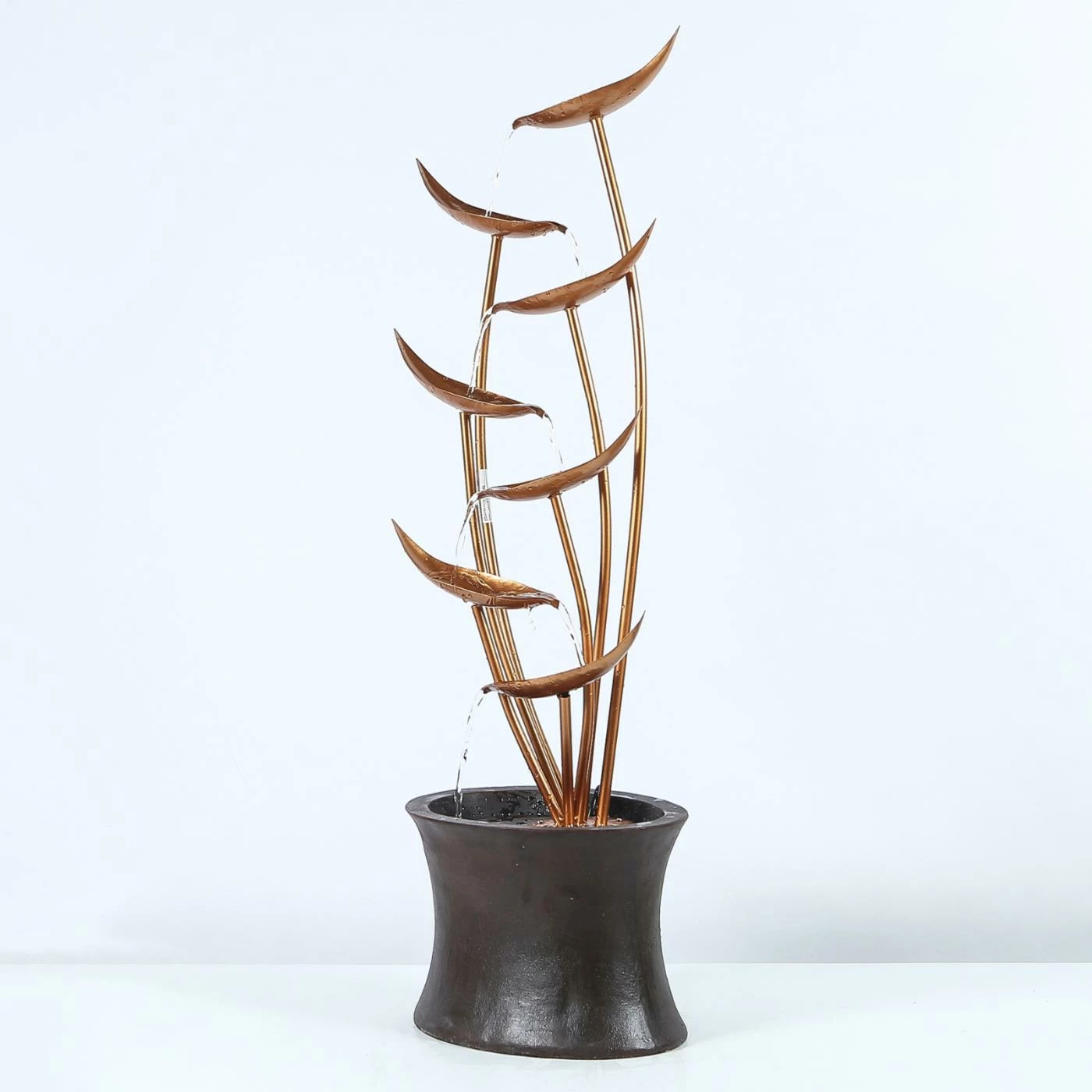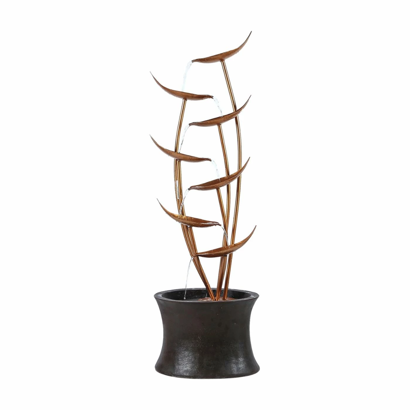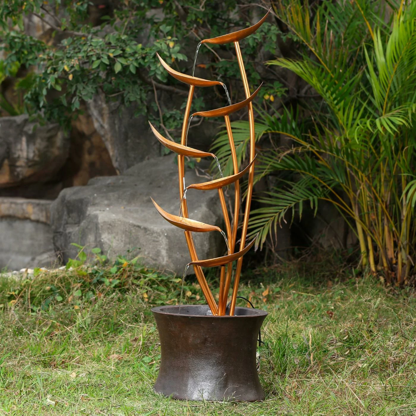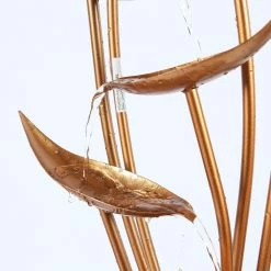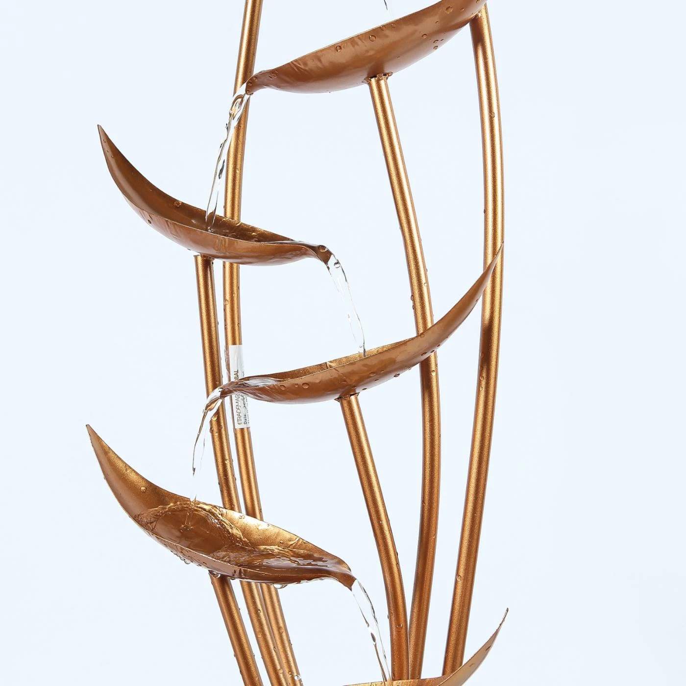 The LuxenHome Rain Forest Leaves Cascading Outdoor Fountain complements your outdoor space with its nature-inspired shapes, but also stands out with a glam finish. This outdoor fountain has a sturdy polyresin base with a dark bronze finish. Iron leaves on tall stems sprout from the base and have a bright, shimmering gold finish. Water cascades from leaf to leaf into the base and is recirculated by the included electric pump.