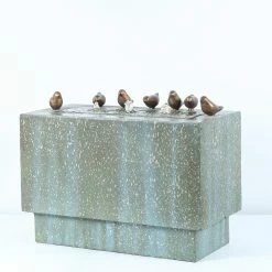 Bronze-finished birds bask near the bubbling waters of the LuxenHome Rectangular Outdoor Fountain with LED Lights and Bronze Birds. This inviting fountain features a modern rectangular design and sturdy cement construction. The cement is finished with a speckled turquoise patina for the look of an aging outdoor accent. Water bubbles from three fountains in the top, each with an LED light for a more dramatic look. An electric pump is included and this outdoor fountain can be added to your garden or patio.