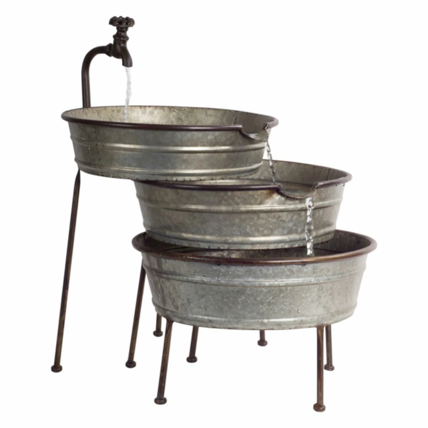 The Melrose International Outdoor Tubs Fountain adds soothing sounds and visual interest to any outdoor space with its water spigot and metal tubs design. Created from metal in a galvanized finish, this outdoor fountain brings rustic style to your favorite outside space.