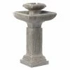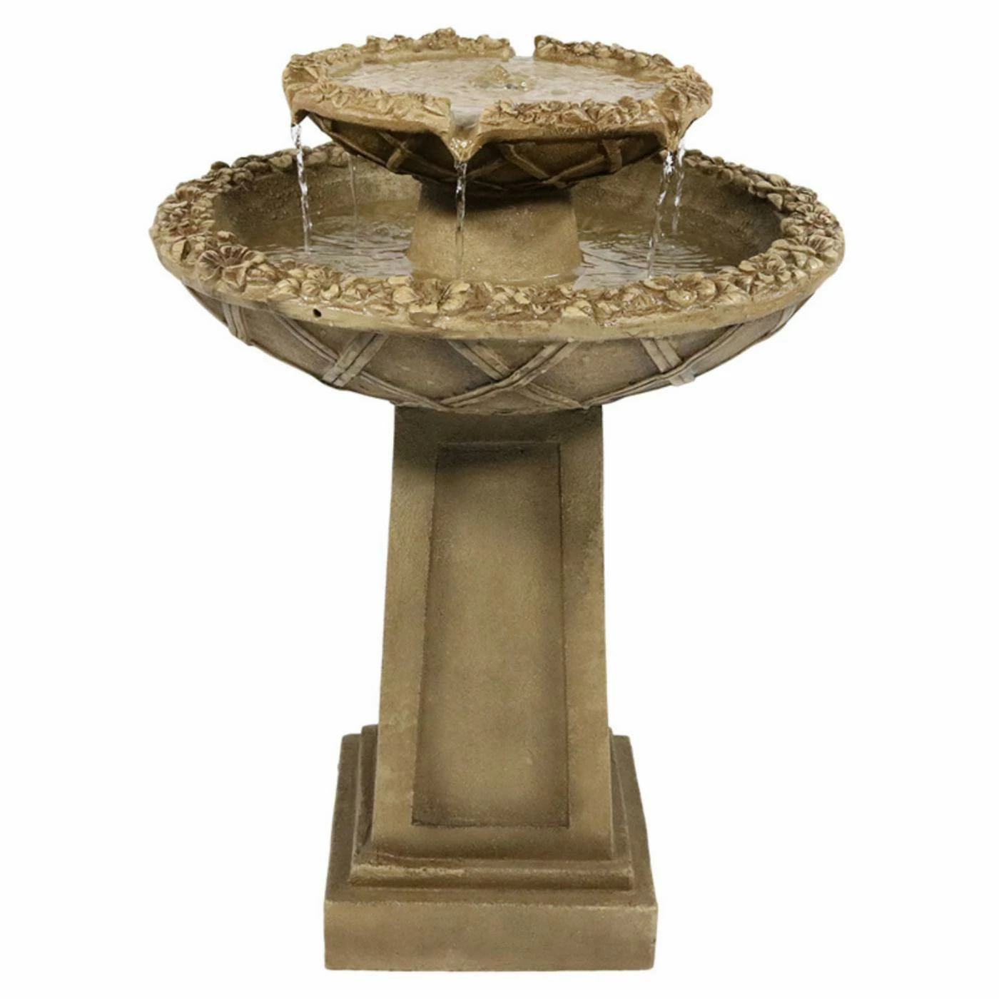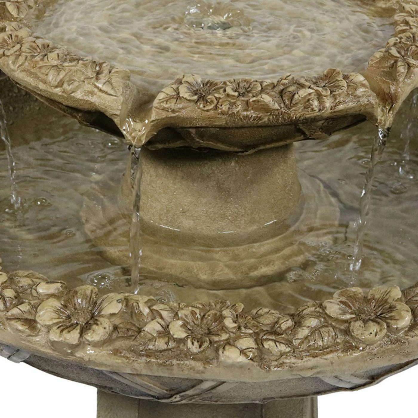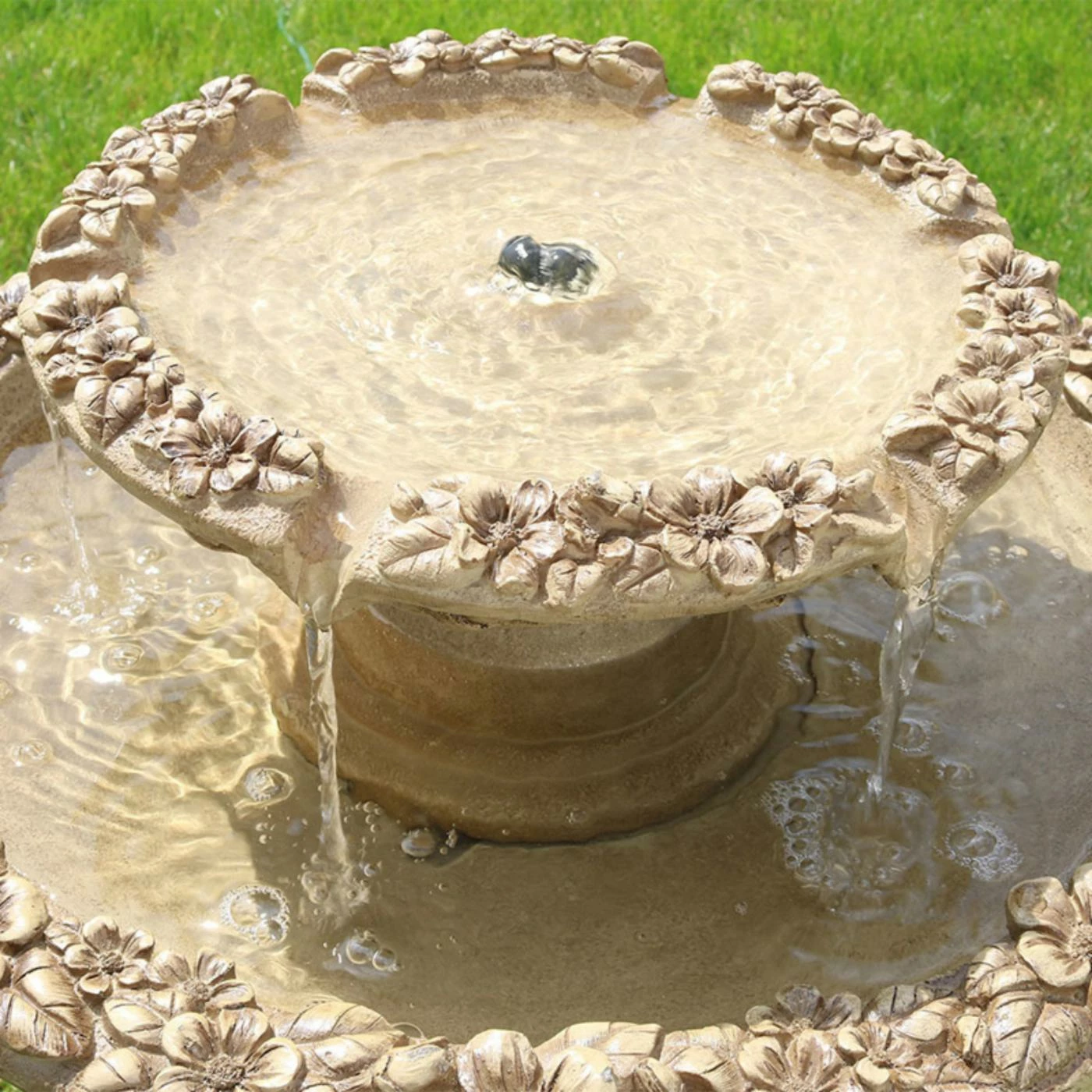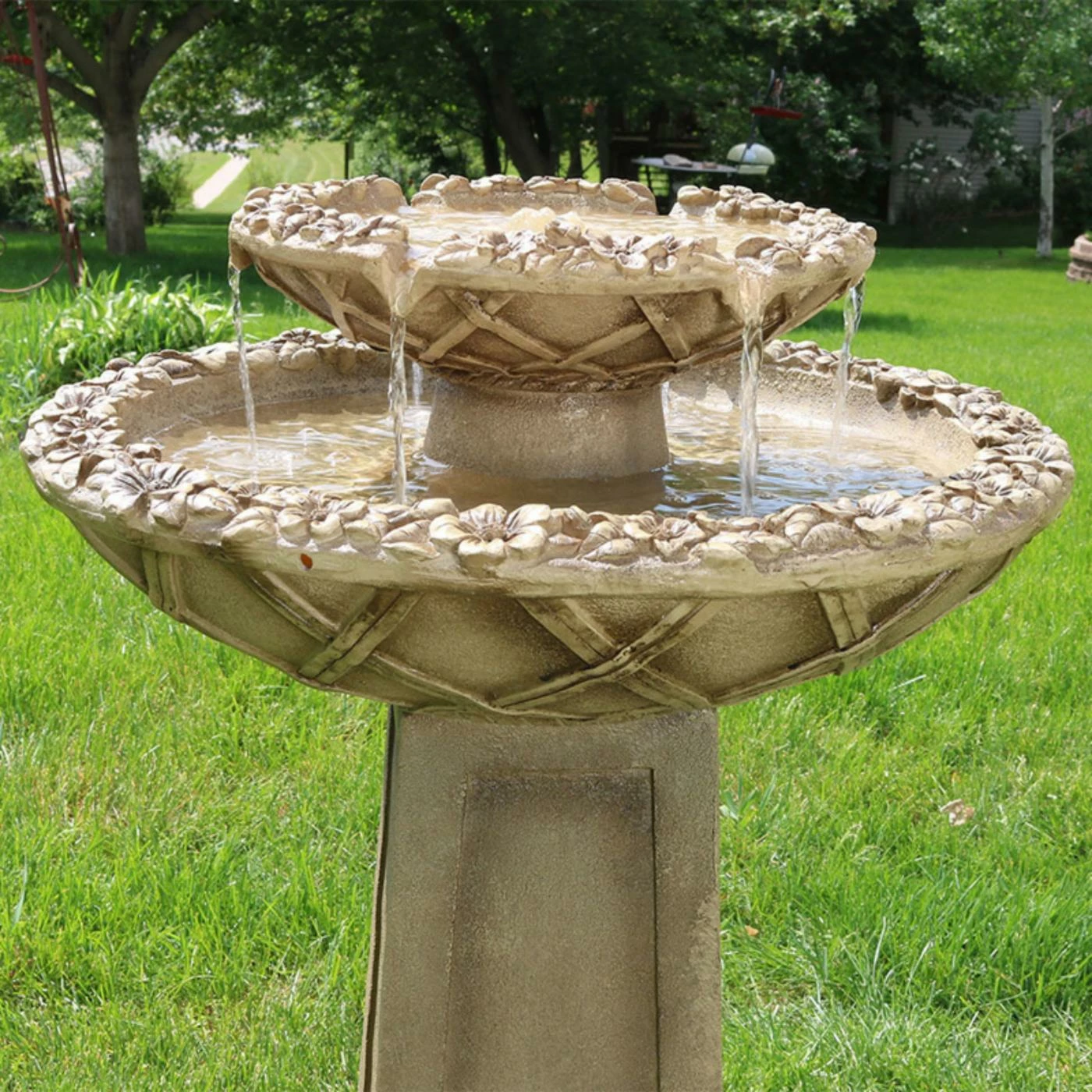Full of charming details, the Sunnydaze Decor 2 Tier Beveled Flower Birdbath Water Fountain makes an attractive addition in any yard. It’s a water feature, ambient noise, and a functioning bird bath all in one piece! Crafted from polyresin with an antiqued stone finish, it’s made to stand up to inclement weather. The electric pump recirculates water, no plumbing necessary! Simply plug it into a standard outlet and enjoy!