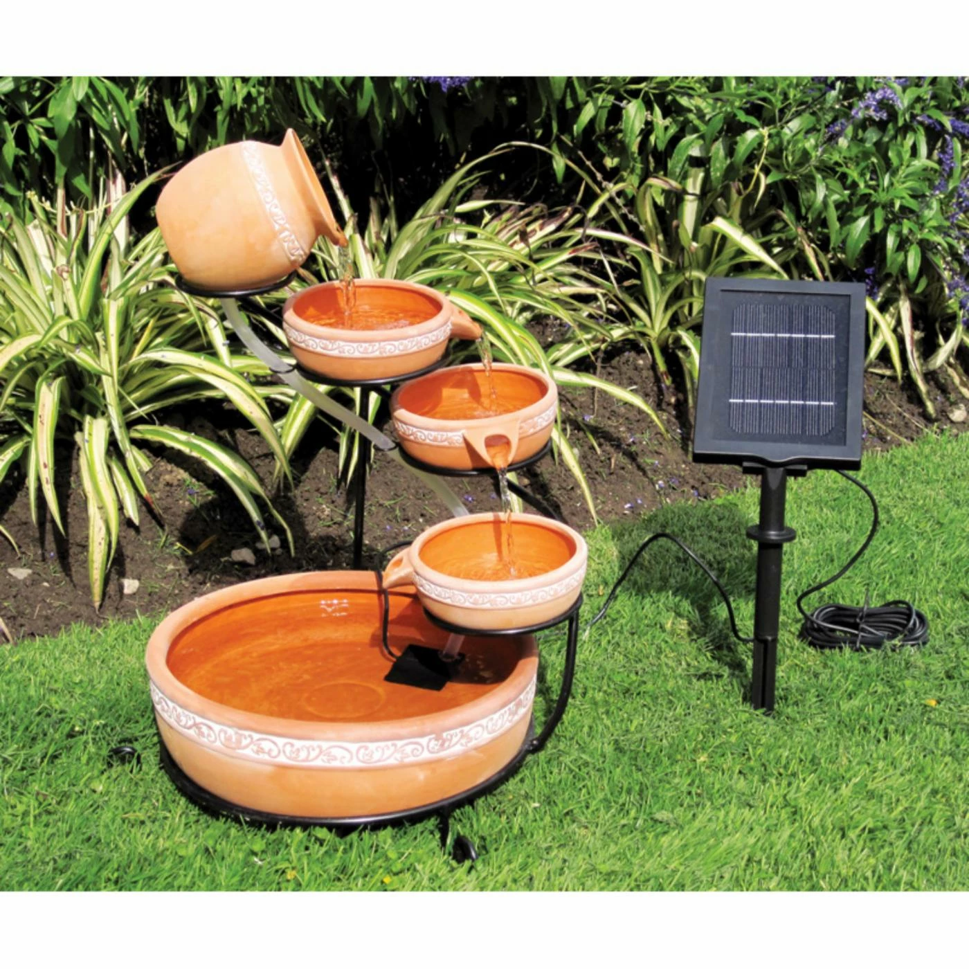 The Koolatron 4 Tier Solar Cascading Fountain adds a soothing sound and a charming, old-world style while asking almost nothing of you. Just add a bit of water to this fully-contained unit and you’re ready to go. The five-piece fountain of natural terra cotta is supported by a metal stand that allows water to splash from top to bottom when powered by the low-voltage pump. The solar panel can be staked into the ground near the pump, which provides all the necessary power to run the pump.