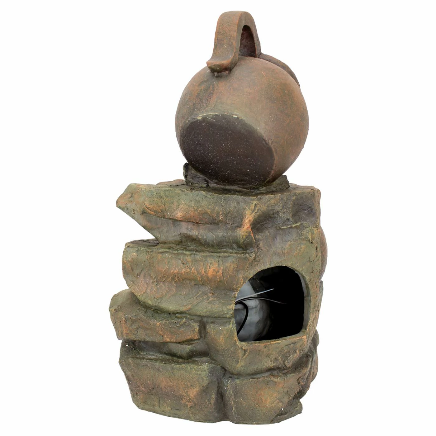 The Design Toscano LaTaverna Cascading Urns Illuminated Garden Fountain depicts a romantic and tranquil scene in durable resin. Due to a hidden reservoir, the water cascades from the pots along the rocks, as if in a never-ending loop. LED lights illuminate the water as it streams for a striking glow.