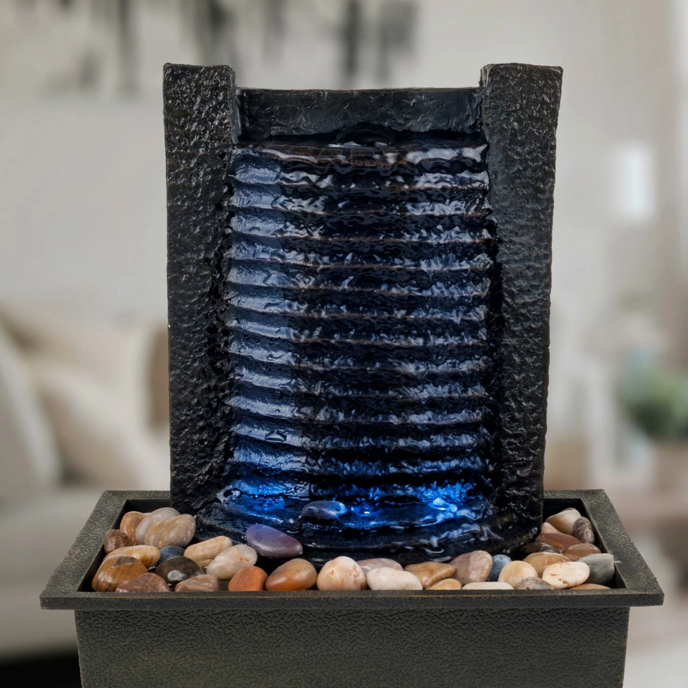 Infuse your indoors with the relaxing sound of flowing water courtesy of the Pure Garden LED Waterfall Tabletop Foundtain with LED Lights. The perfect accent for flat surfaces, this fountain features a mesmerizing ribbed wall replete with 3 LED mood lights. An electric pump cycles water up to the fountain top, where it spurts out and cascades down the polyresin walls before circulating into a bed of natural river rocks. The fountain easily lifts from the base for easy access to the pump and lights. To fill, simply pour water into the basin.