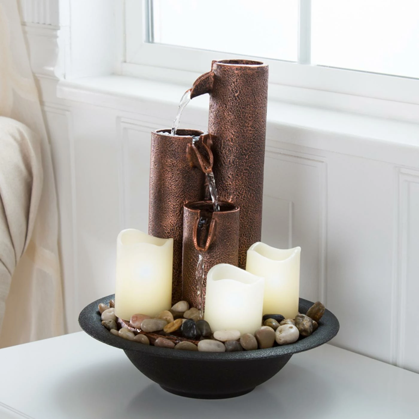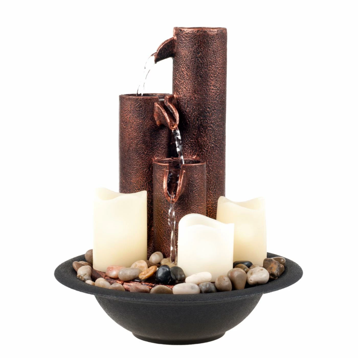 Infuse your indoors with the relaxing sound of flowing water courtesy of the Pure Garden Tiered Column Tabletop Fountain with LED Lights and Candles. The perfect accent for flat surfaces, this fountain features three stunning bronze-finish basins. An electric pump cycles water up to the fountain top, where it spurts out and cascades into each polyresin tier, then circulates into a bed of natural river rocks. White LED lights set into opaque white candles complete the mesmerizing atmosphere. The fountain easily lifts from the base for easy access to the pump and lights. To fill, simply fill the base with water.