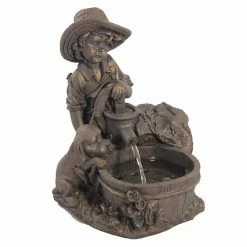 Bring a lively water addition to your yard with the Sunnydaze Decor Sunnydaze Boy with Dog Solar On Demand Water Fountain with LED Light. It features an adorable country scene with a child pumping water and a dog looking on. This unique fountain is crafted from polyresin and fiberglass with a metallic brown finish. It is solar-powered for energy efficiency, and a fully-charged battery operates the pump for up to four hours.