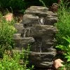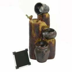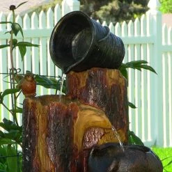 The Sunnydaze Decor Sunnydaze Cascading Log and Buckets Solar On Demand Water Fountain is the perfect water feature for rustic yards. Itβs crafted from polyresin and fiberglass with a detailed, textured finish. Water cascades down three varied tiers and recirculates to the top. Powered with a solar battery, the pump can run up to four hours when fully charged.