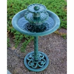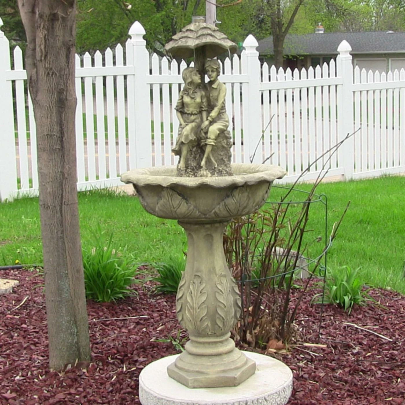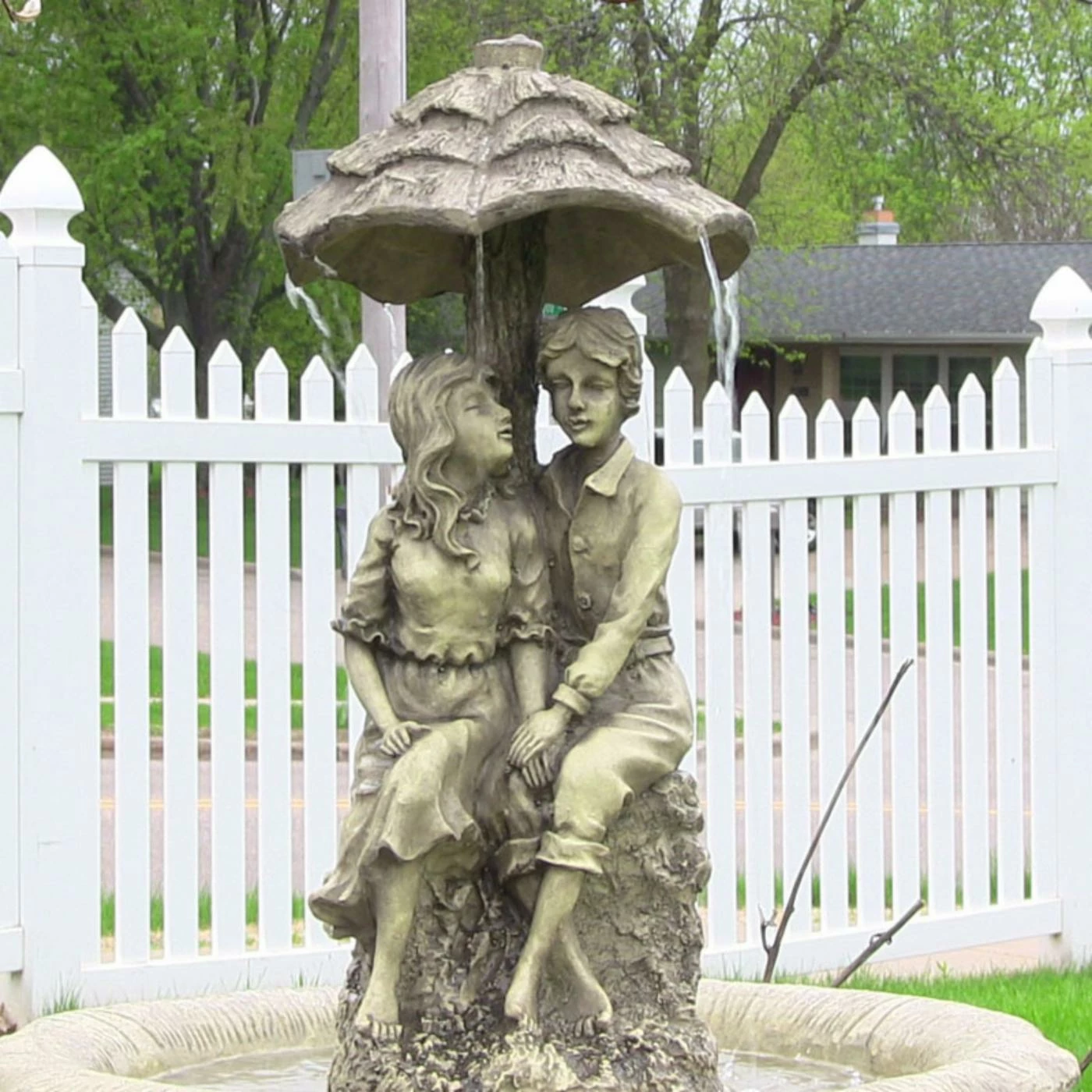 Perfect for English and old-world-inspired gardens, the Sunnydaze DΓ©cor Sunnydaze Lovers Umbrella Solar On-Demand Outdoor Water Fountain with LED Lights depicts a romantic couple holding hands while water flows atop their umbrella. Leaves decorate the pedestal base and bowl. Crafted from polyresin and fiberglass with an antique beige finish, it is solar-powered for energy efficiency. The battery charges even when cloudy, and will run the pump for four hours when fully charged.