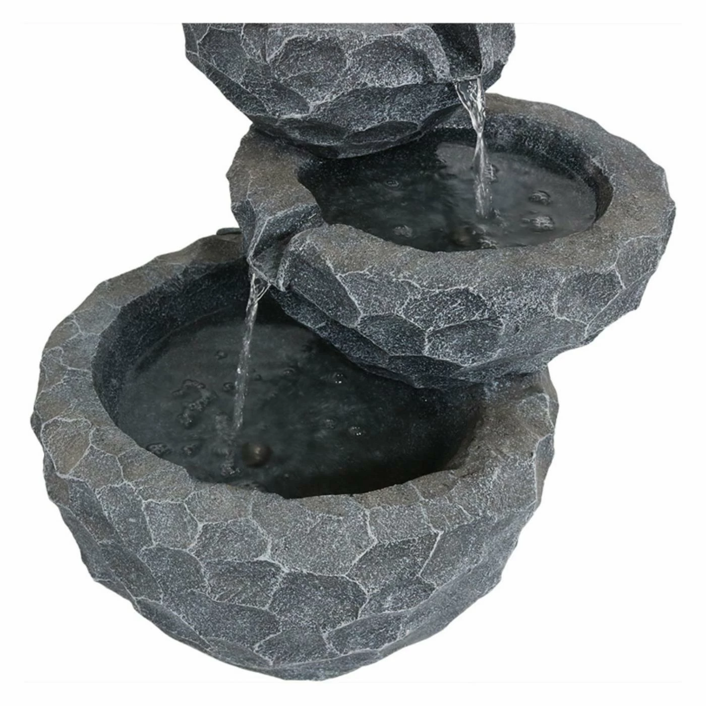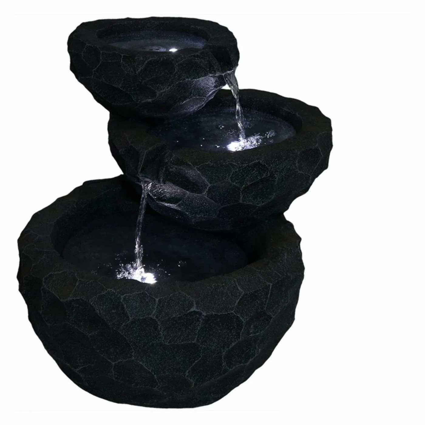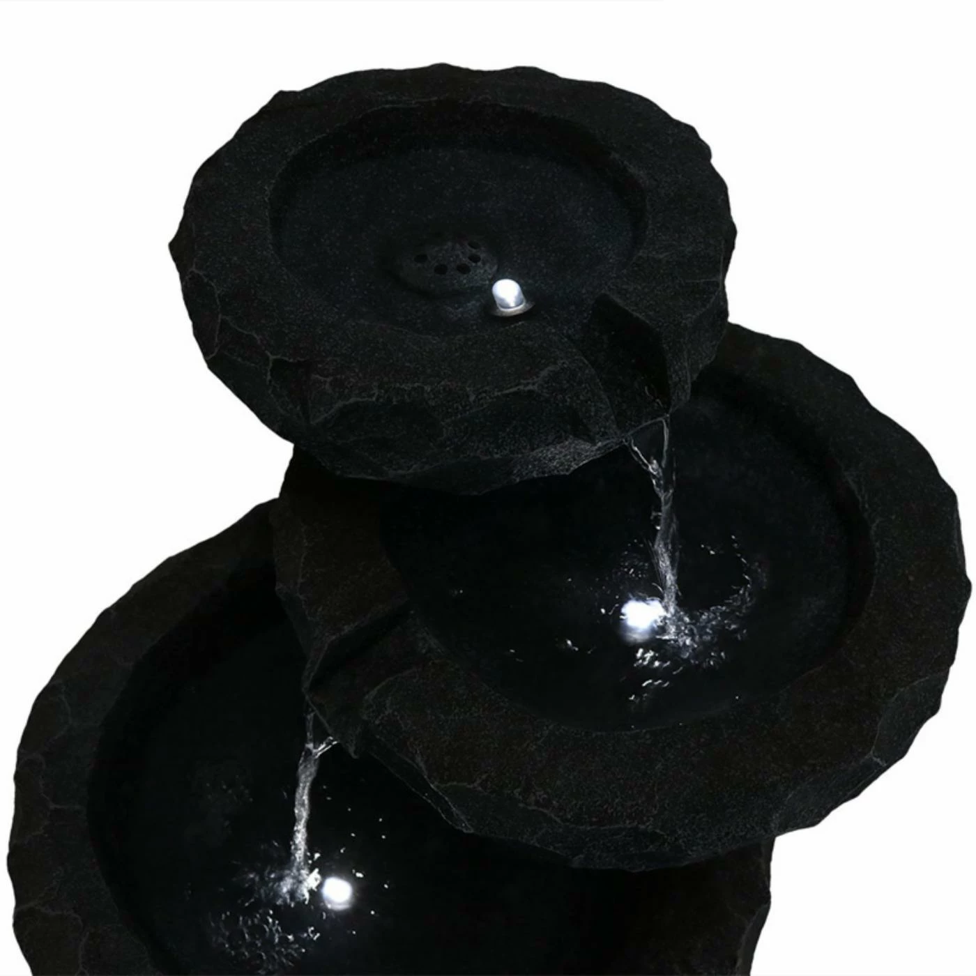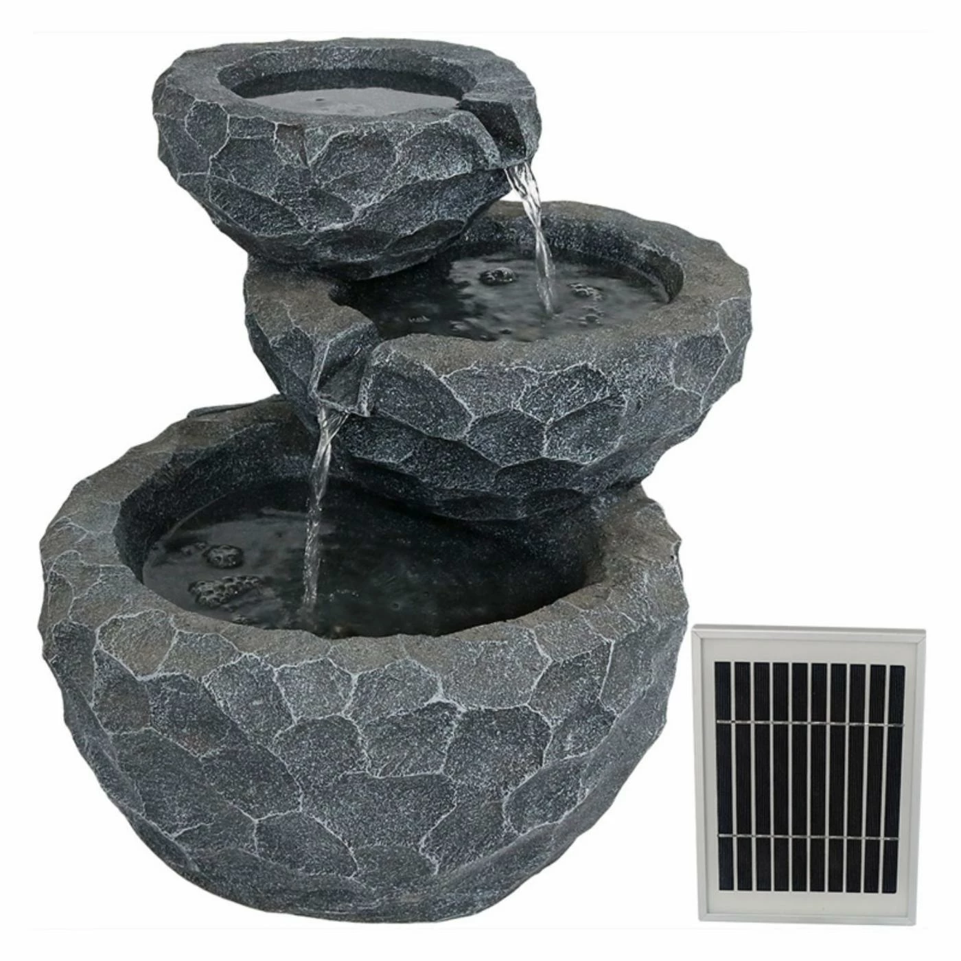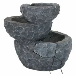 Sized for smaller spaces, the Sunnydaze Decor 3-Tier Chiseled Basin Solar on Demand Garden Fountain brings the soothing sounds of water to your apartment, balcony, or patio. Add a nature-inspired touch to any garden, patio, porch, or backyard with this Solar Battery Backup water fountain. Simply connect the solar fountain pump to the tube in the fountain, connect the LED light cord and solar pump cord to the solar panel and place the solar panel in the sun. With solar-only mode, the pump will run using the direct sunlight over the solar panel. To use the battery mode, press the Battery On/Off button and the battery will now power the pump. On the battery mode, the fountain will run up to four hours on cloudy days or at night.
