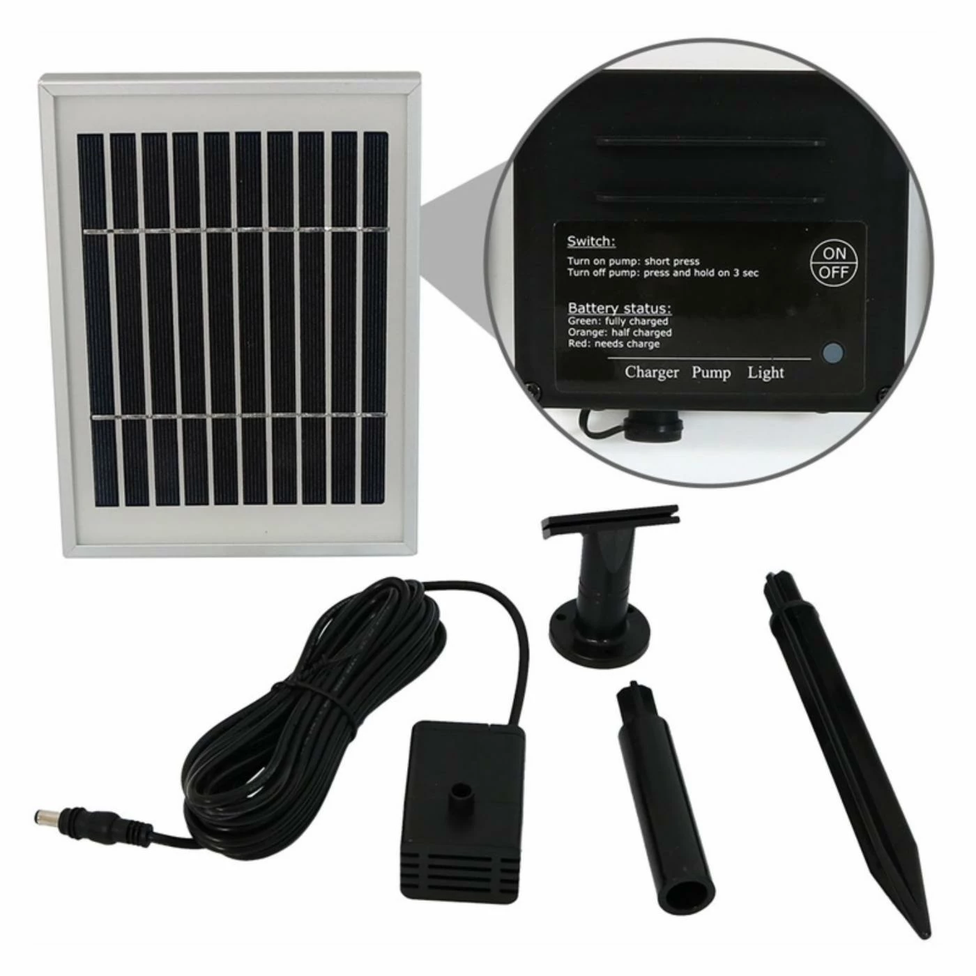 - Includes solar panel, rechargeable battery pack