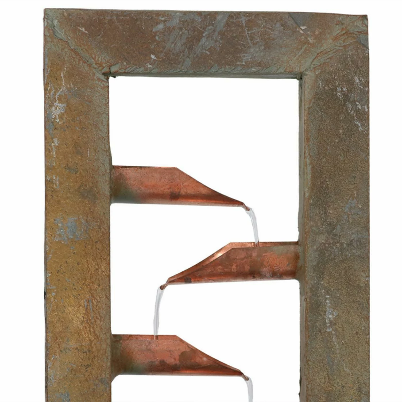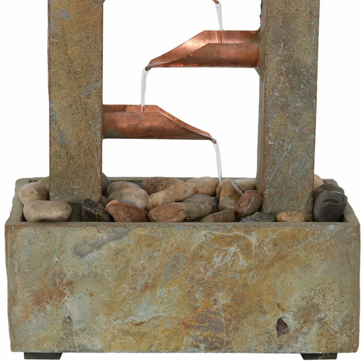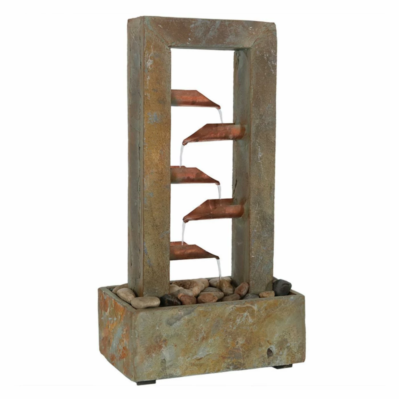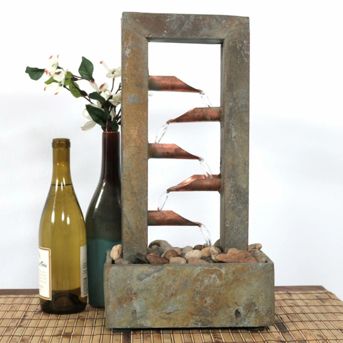 Water flows from gleaming copper pipes in the Sunnydaze Decor 5 Tier Slate Flowing Gardens Indoor Tabletop Water Fountain. This indoor water fountain is made of natural slate and includes river rocks in the basin. It’s easy to use, simply plug into any standard outlet to get an instant Zen vibe.