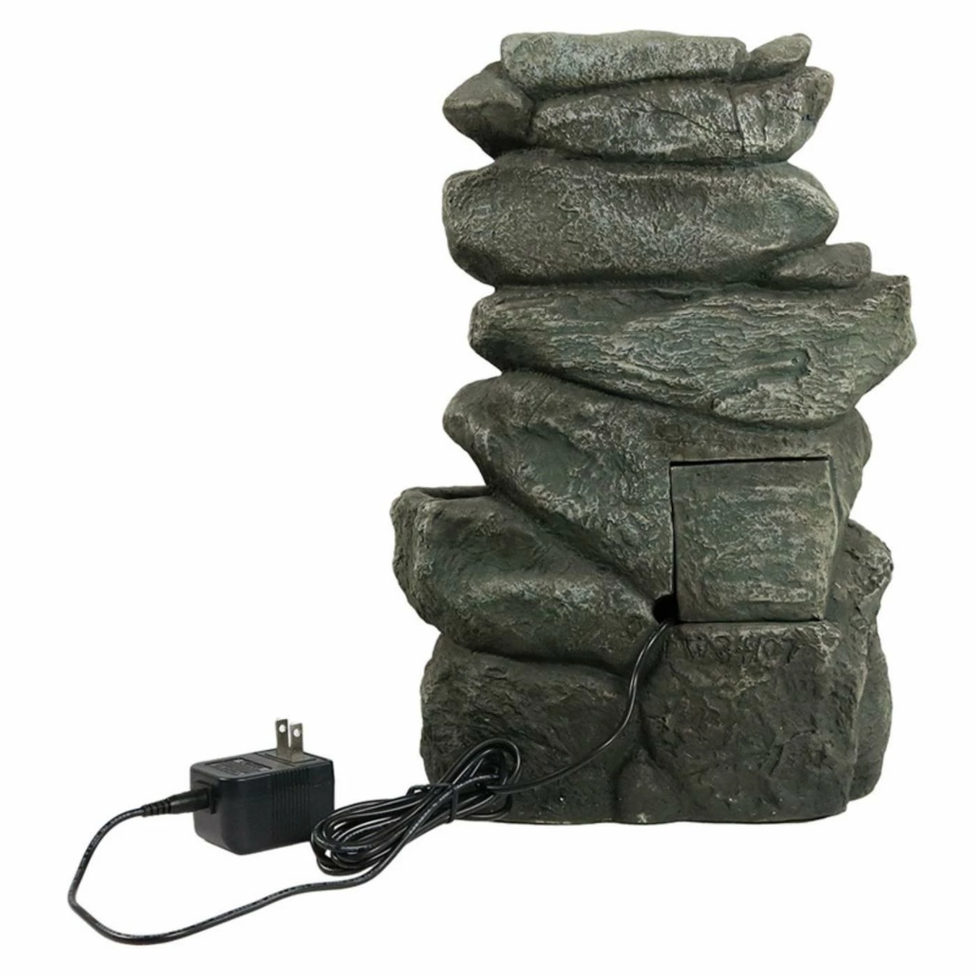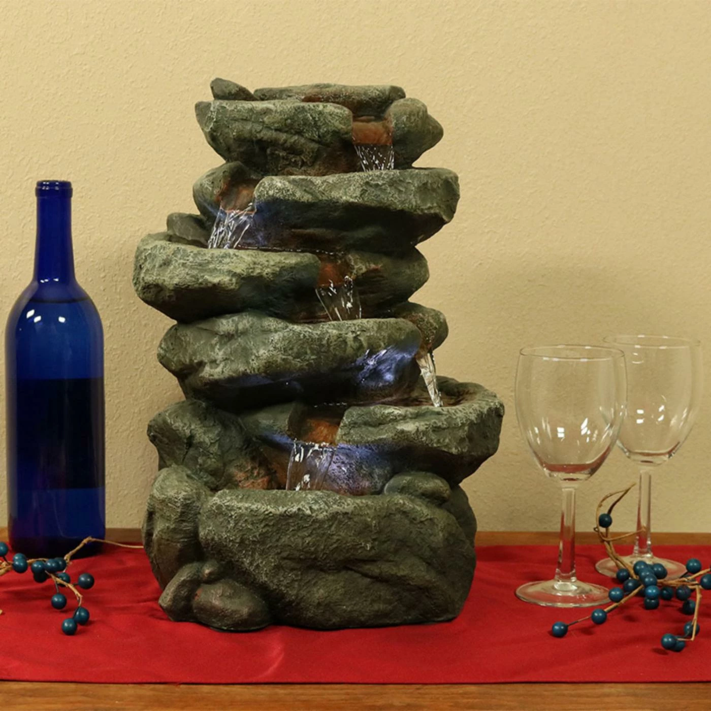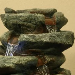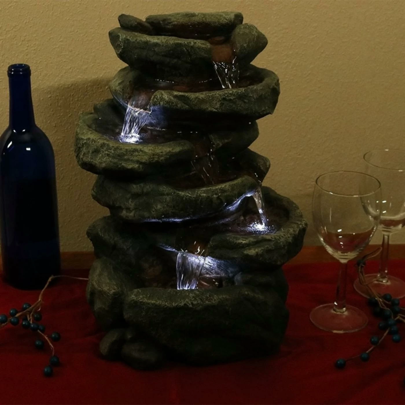 Behold the stilling serenity of a waterfall from the comfort of your own home with the Sunnydaze Decor 6 Tier Stone Falls Tabletop Water Fountain with LED Light. Designed to look like natural waterfalls, this fountain is made from durable yet lightweight resin with a realistic rock-like texture and finish. LED lights illuminate the water pools and make for a charming nightlight. The electric pump recirculates the water, so there’s no need for plumbing – simply plug it in and enjoy!