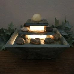The Sunnydaze Decor Ascending Slate Tabletop Water Fountain with LED Light adds a Zen-like ambiance to any room. Soothing sounds and light help to enliven and calm surrounding areas. The Japanese-inspired design is made of slate with a natural patina and features river rocks for the water to flow over. A single LED light provides nighttime illumination. The fountain operates with an electric water pump for convenient installation.