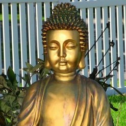 The Sunnydaze Relaxed Buddha Garden Fountain adds a peaceful, zen-like feel to your outdoor space. This lovely fountain has a golden finish to give it a regal look, and water flows delicately into Buddha’s hands. The resin construction is built to last, and the fountain includes a submersible pump.