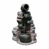 - Water cascades out of 3 spigots, into collecting bowl, where it trickles into basin