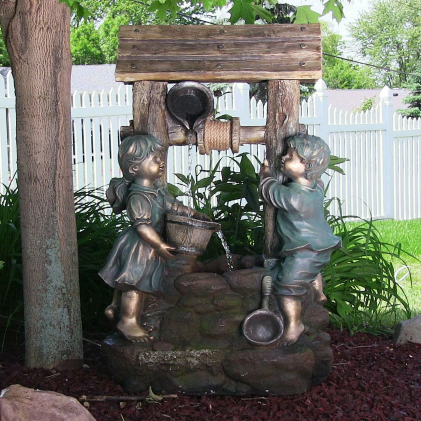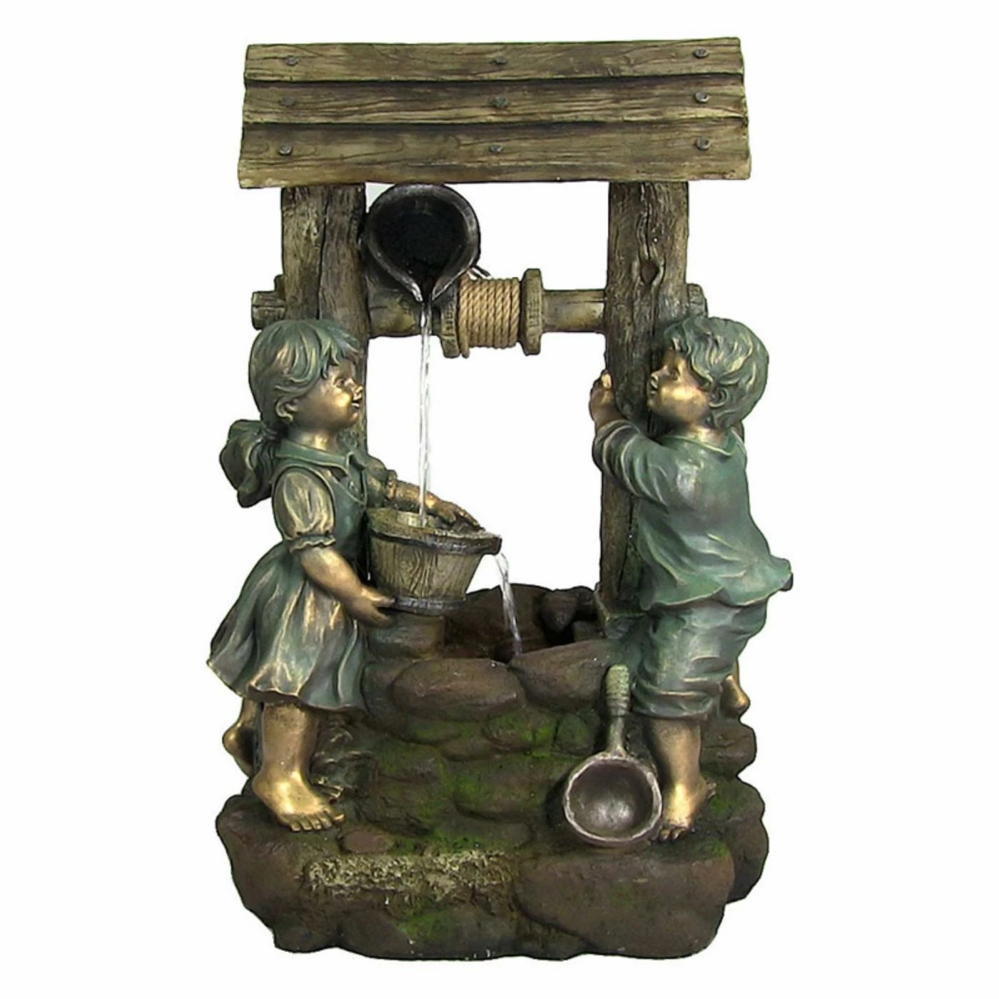 The Sunnydaze Children at the Well Fountain with LED Light will bring joy and smiles to your outdoor space. This lovely fountain features a sweet boy and girl gathering water from a well for a cute design. The recirculating pump helps water flow with adequate power, and an included LED light illuminates it at night.