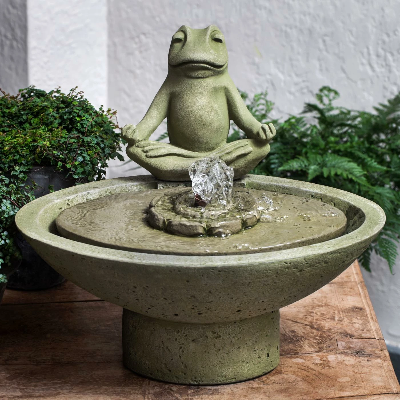 Lighthearted and whimsical, the Campania International Garden Terrace Meditation Outdoor Fountain features a froggy fellow sitting nimbly along the edge of the basin. This delightful indoor-outdoor fountain is crafted of cast stone that lasts a lifetime and is finished in a hand-applied patina that ages naturally over time. The included pump recirculates water, conserving resources and removing the need for additional plumbing.
